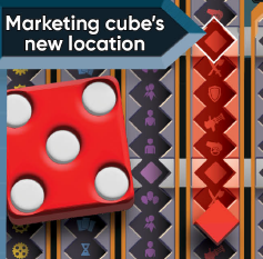 2) 各プレイヤーは、5つのマーケティングキューブを、マーケティングエリアの各列に、キューブの色がそれぞれのマーケティングトラックに一致するように、0◇の位置に置きます。
