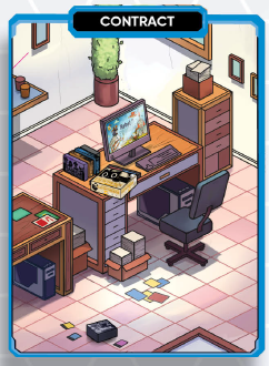 6) 各プレイヤーは3枚のカードを引き、少なくとも1枚を選択して契約エリアに表向きに配置します。残りのカードは、工場のコンポーネントセクションに裏向きに配置されます。