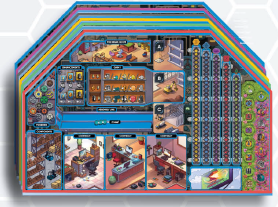 工場ボード6枚 各プレイヤーは、自分の色の工場を受け取ります。プレイヤーは自分の工場で、倉庫で入手したコンポーネントを保管し、新しいゲームを製作する契約を結び、マーケティング活動を追跡し、工場を強化するための機械や構造物を設置します。 |