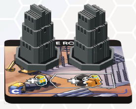 5) 構造物を取ります(9ページ「構造物のドラフト」で説明されています)。3つの構造物タイルを、対応するA、B、Cスペースに配置します。