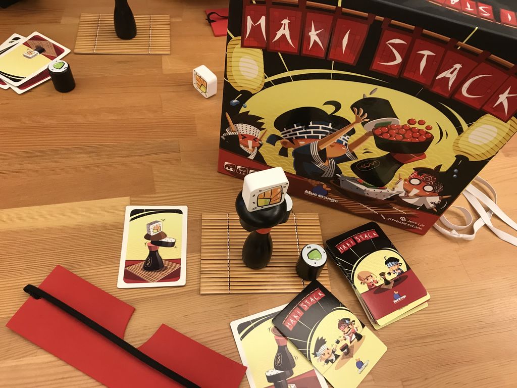 よくあるお題通りに作るスピードアクションですが、ゴロゴロとしたコンポーネントに絵の可愛らしさキッズゲームらしさに振り切っていていいと思いました。「何故、寿司?」というツッコミどこは最後まで解決されませんでしたが、箱の表紙や絵の可愛さに許せました。指示(無茶振り)は2つとも、ゴロゴロとしたサイズだからこその内容で楽しく遊べたのですが、2種類では少なくて飽きました。もっと色々な無茶振りをしてほしかったなぁとは思いました。