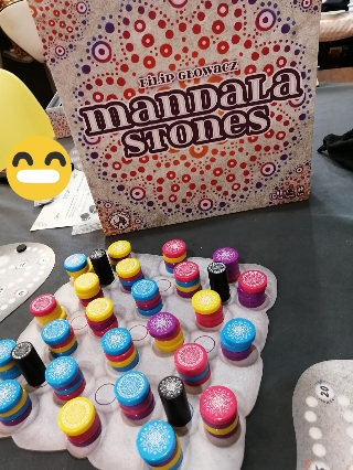 手番ではランダムに積み重ねられたストーンを黒の駒を動かして、デザインが一緒の四方のストーンを獲得して個人ボードに配置します。
