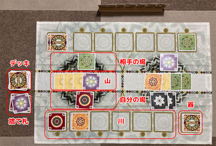 2つある曼荼羅は「場」と「山」で構成され、両プレイヤー、「川」と「器」がある。