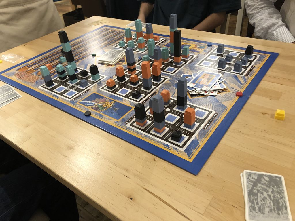 先行逃げ切り型や、大まくり型、中盤当たりから場をコントロールしようしたり、各プレイヤーの考え方がプレイに反映され、それを読みながらどこにビルを配置していくのか手札と相談していきます。