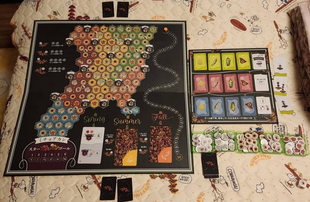 手番は春4回、夏5回、秋6回の計15回行い、その季節毎のランダムで決められた季節目的カードを達成しつつ、チョウ駒を移動させ、最終的に得点を競い合うゲームになります。