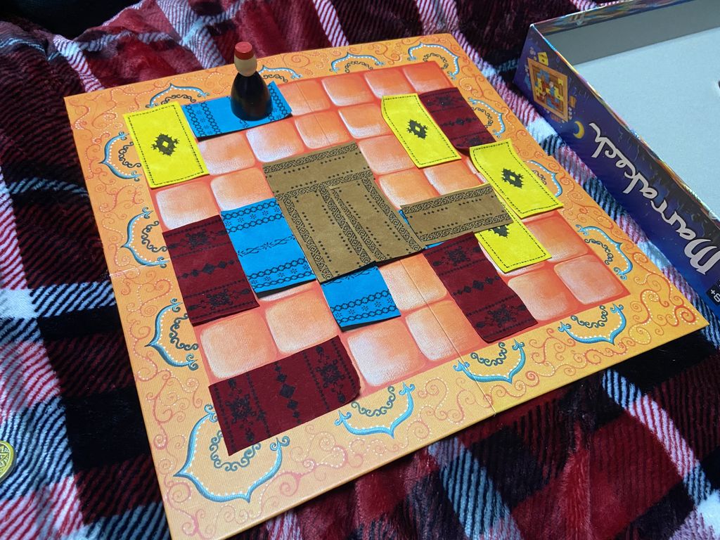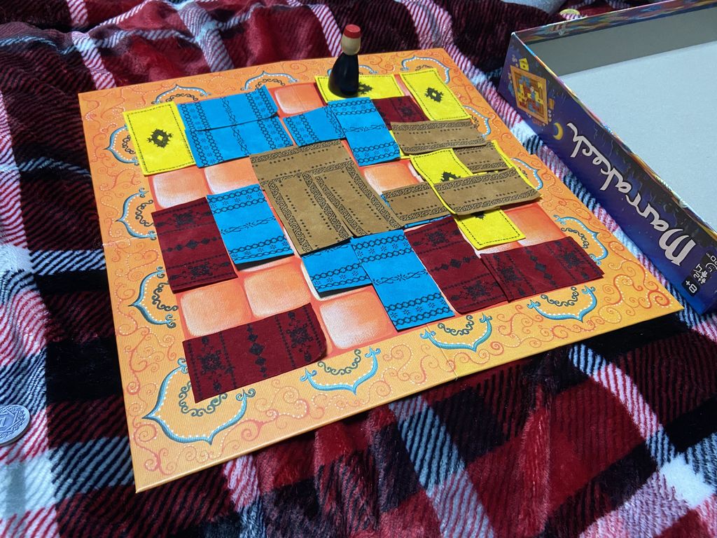 終盤手前に相棒(青)が自分(茶)を踏み、11金(ディルハム)の収入。しかしその後エリアを分断され、収入伸びず。小相棒(黄)は5〜8金を安定して稼ぐ。そのまま小相棒が逃げ切り一位。
