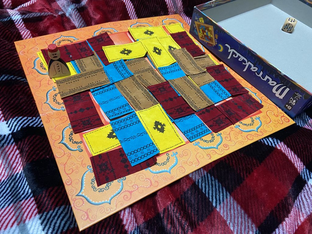 ルールもシンプル。商人の進む方向を決めてダイスを振る。出た目の数だけ進んで、止まった位置の絨毯の面積分だけお金を支払う。全ての絨毯が敷き終わったら得点計算。持っているお金+メインボードに存在する自分の絨毯の面積を合計して、一番高い人が勝者。