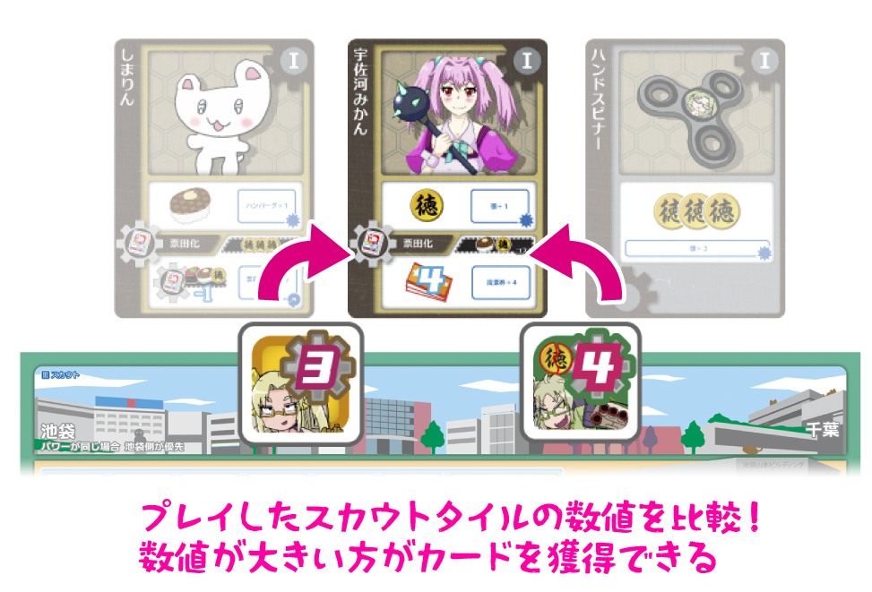 勝負にはタイルが必要で、同じカードを狙うプレイヤーと数値を比較し、