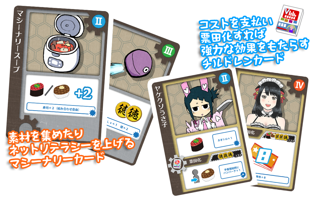 カードには「素材(ネギトロ・ハンバーグ等)の獲得」「ネットリテラシーレベルの上昇」「投票券の獲得」などの基本的な効果の他に、