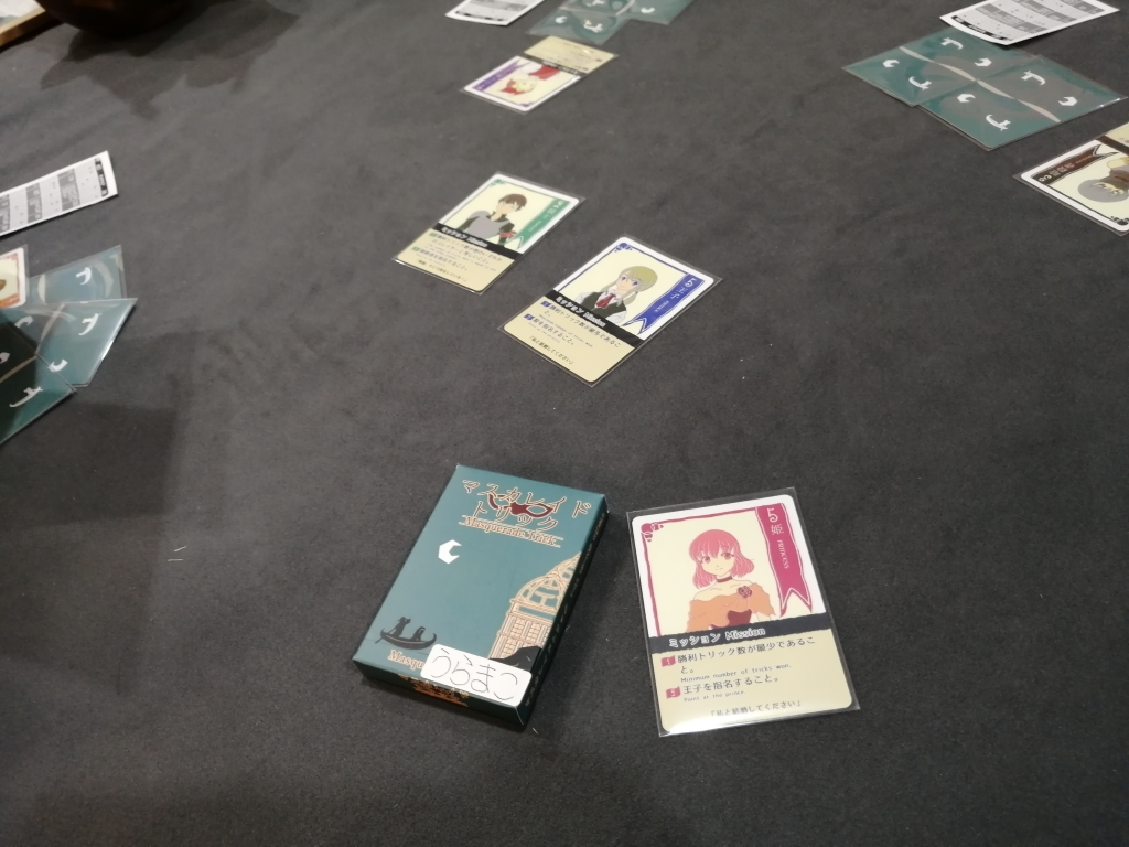 仮面舞踏会に現れた面々はそれぞれ目的があり、目的を達成するためにトリックテイキングで正体を調べていく。