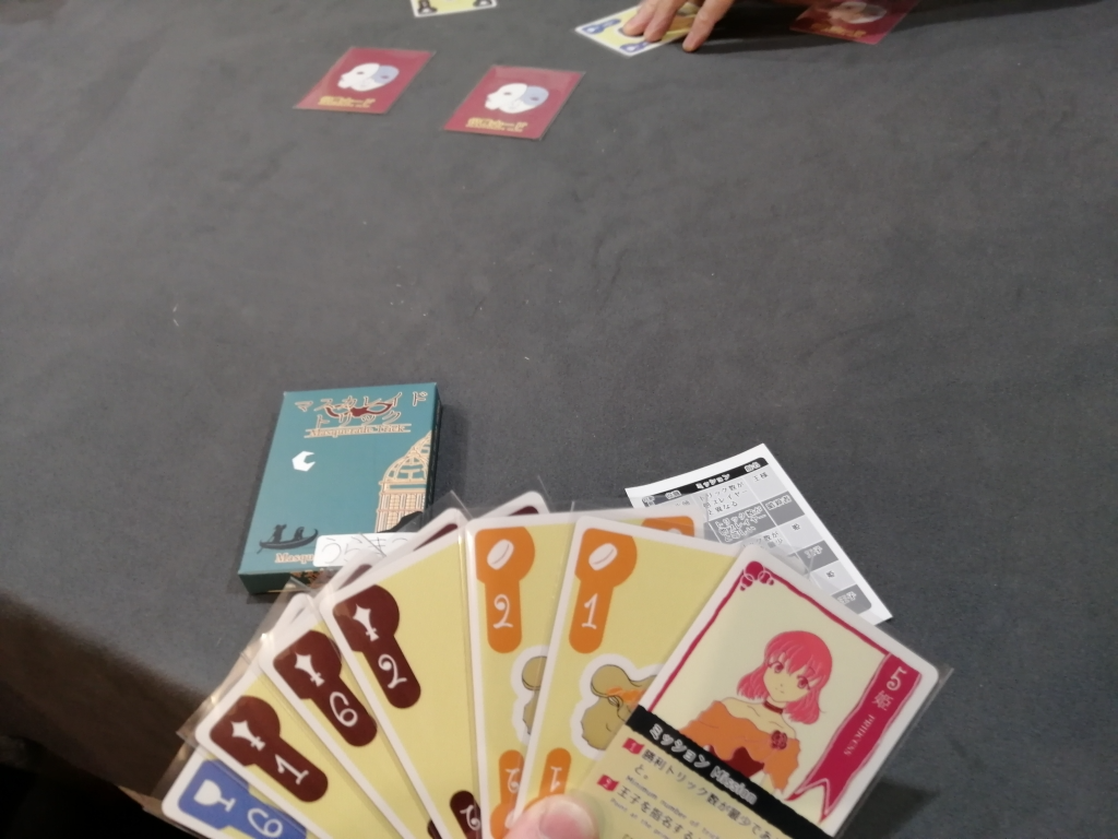 ゲームのほうは、正体隠匿系のトリックテイキングゲームで6人のキャラクターカードがいて、それぞれがトリックでするべきミッションや指名すべきキャラクターが違います。