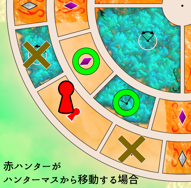 この表面には赤と青のハンターコマを移動させるアクションが描いてあります。
