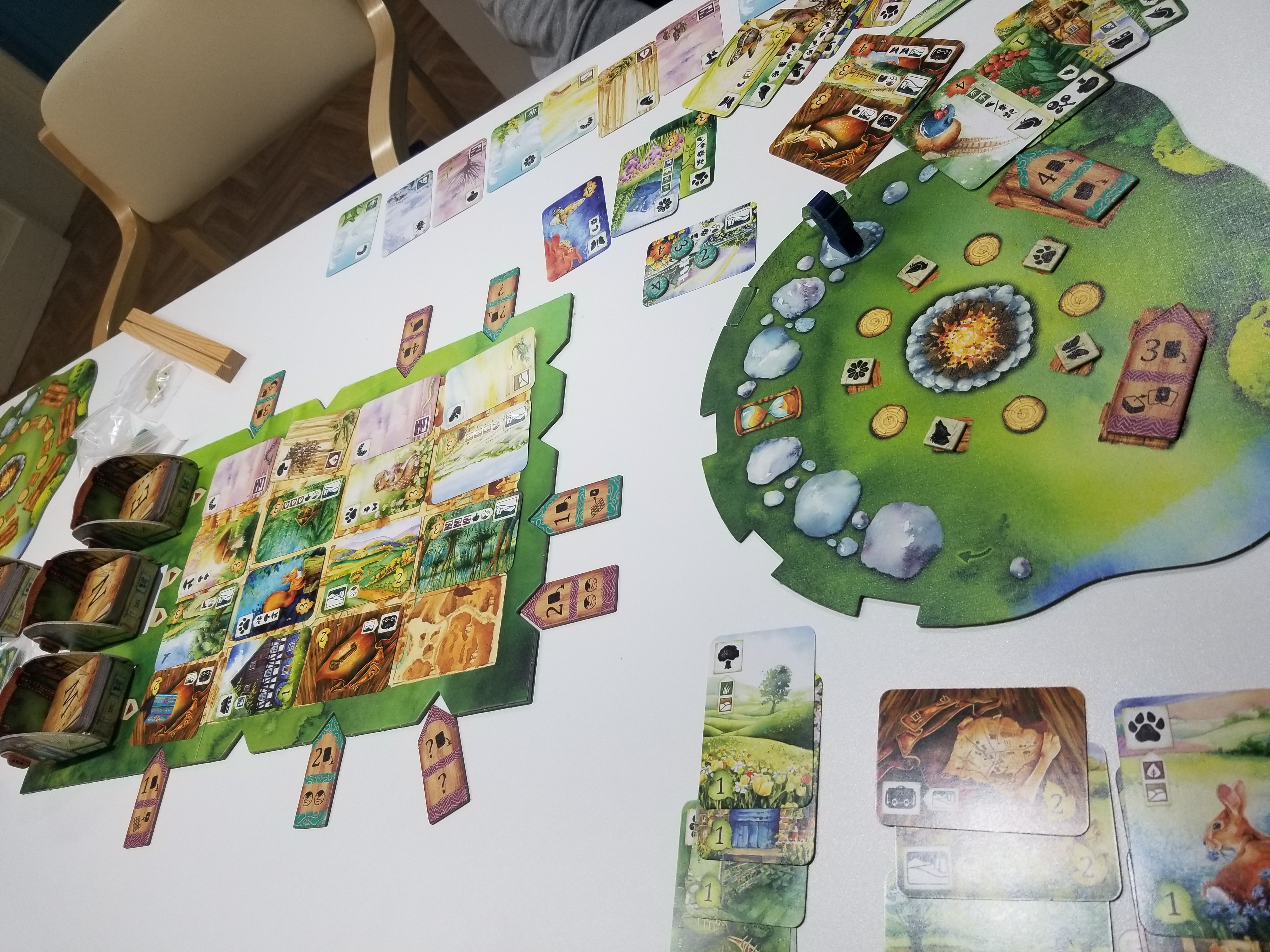 草原(場)にカードが並び、二人プレイなのでユルユルじゃんと思っていましたが、いやいや、そんなことはなく、なかなか思うようなカードは取れないです。矢印タイルを差した列で、1-4番目のカードを取るのですが、結構、キツツキで取りたいカードは取れず、矢印タイルのお尻を上手く使うことで、点数を伸ばせると思いました。