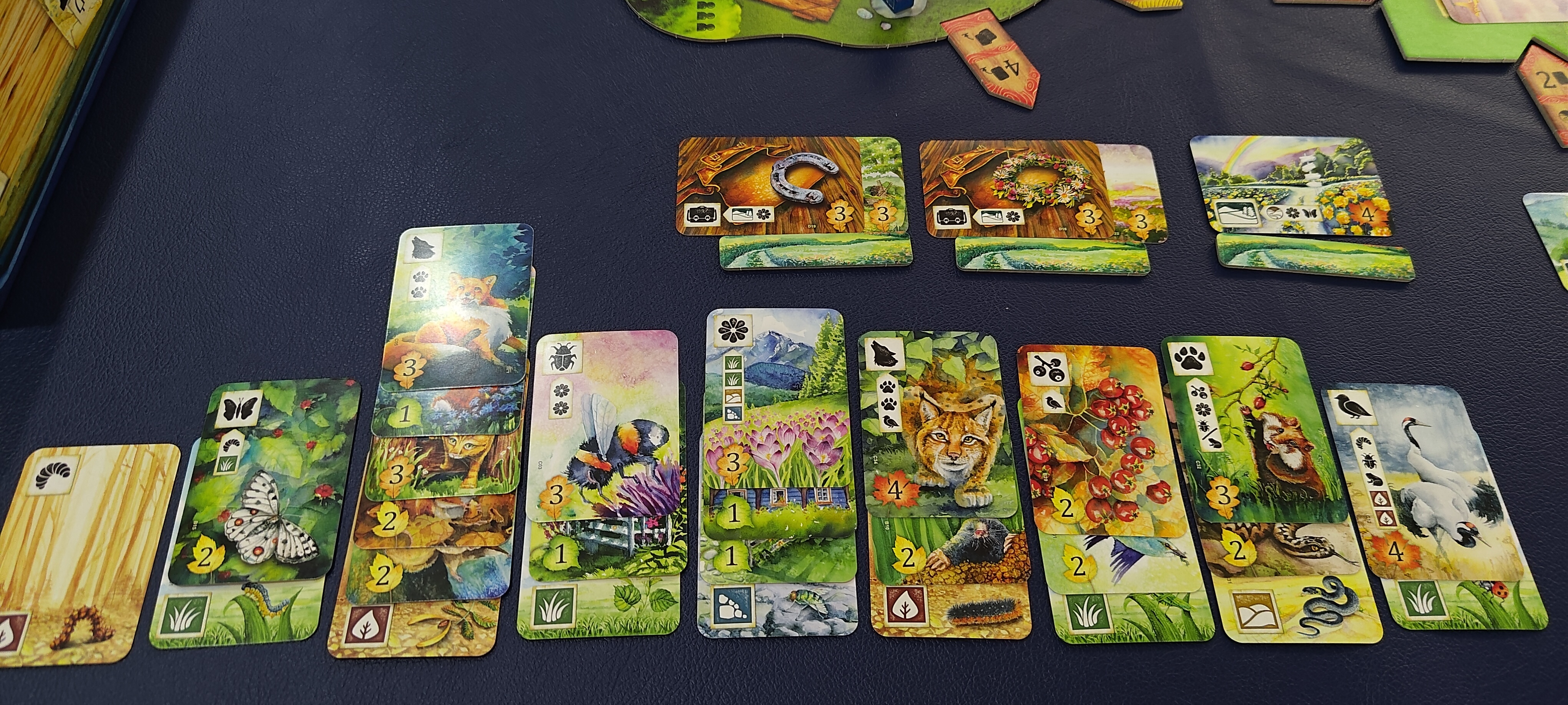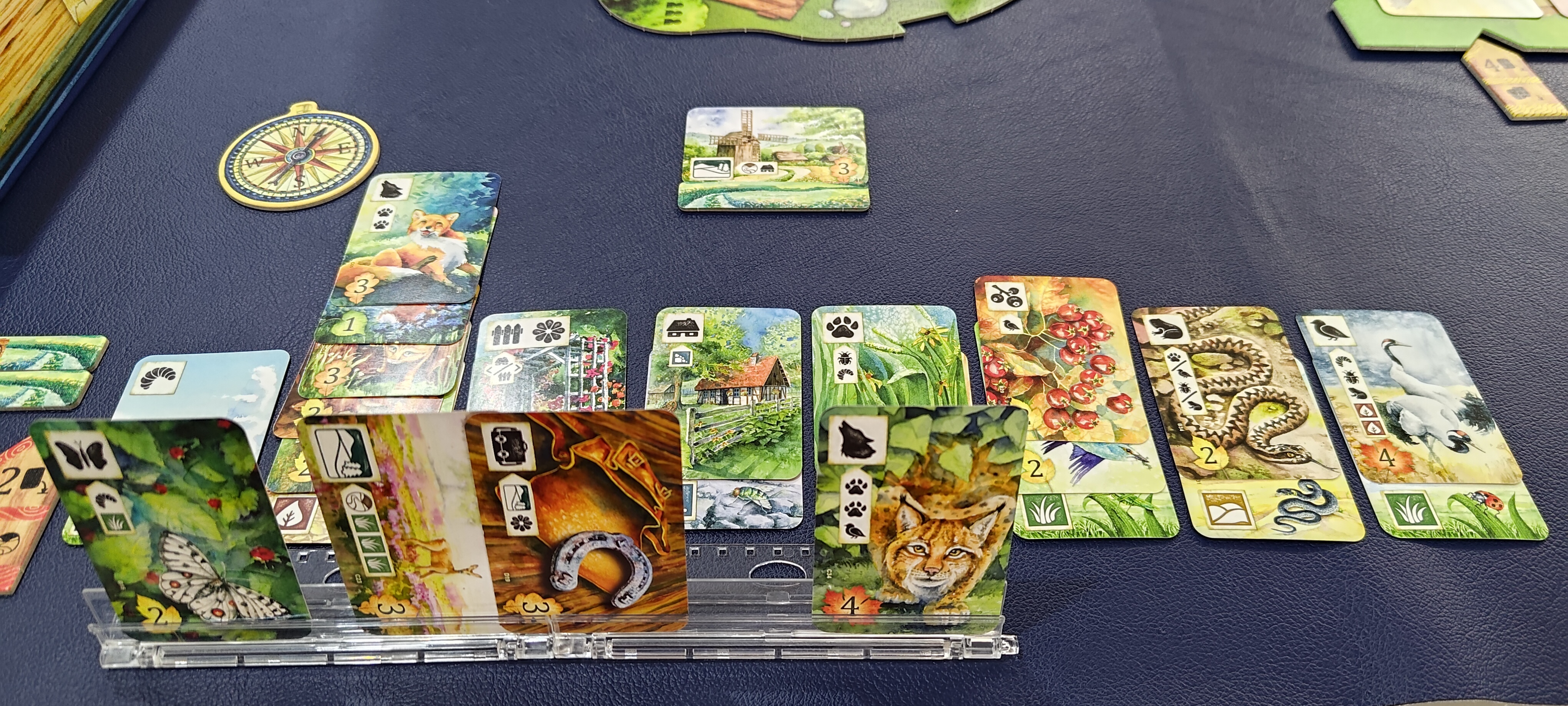 基本的な手番の動作は、メインボードに自分のアクションタイルを差してカードを取得して、自分の場に手札を配置していくだけ。これとは別に特殊アクションがあるが、総じてかなりシンプルな処理。