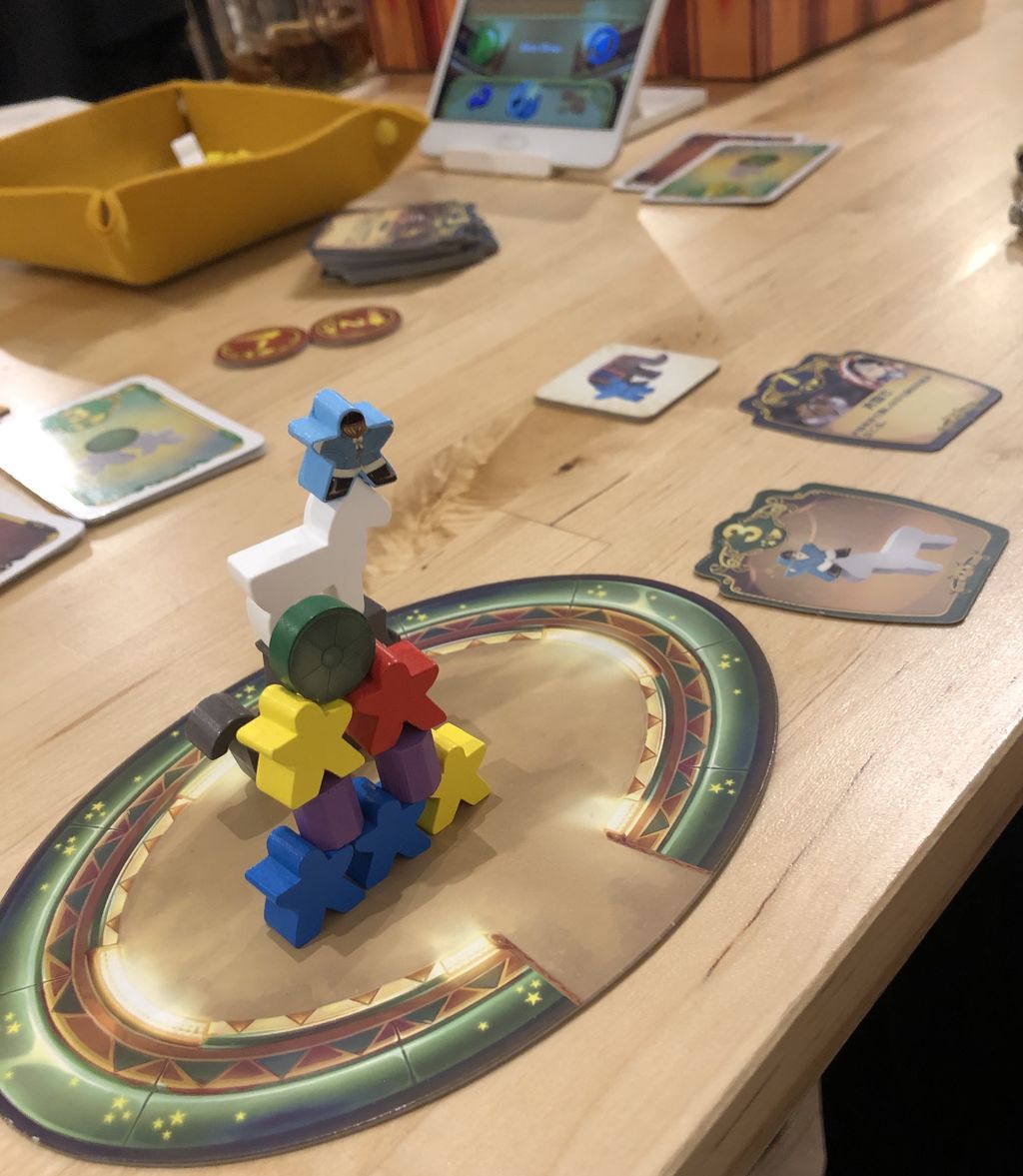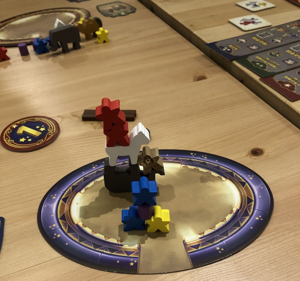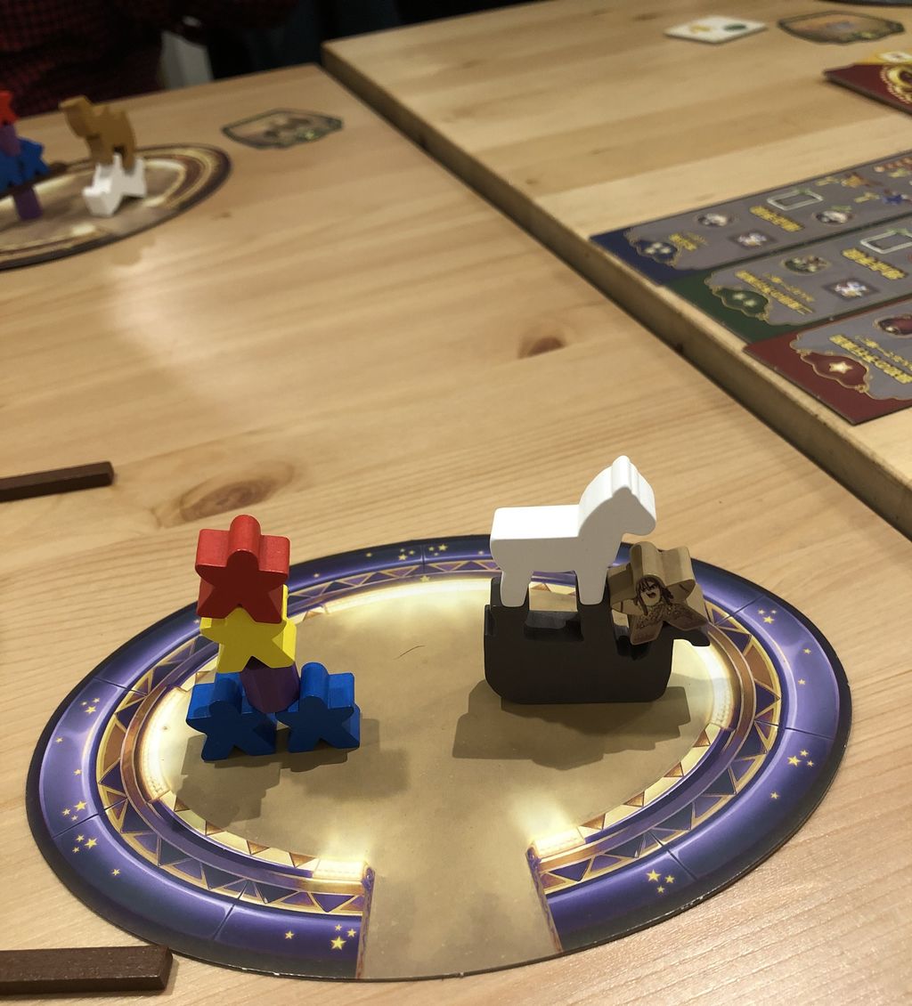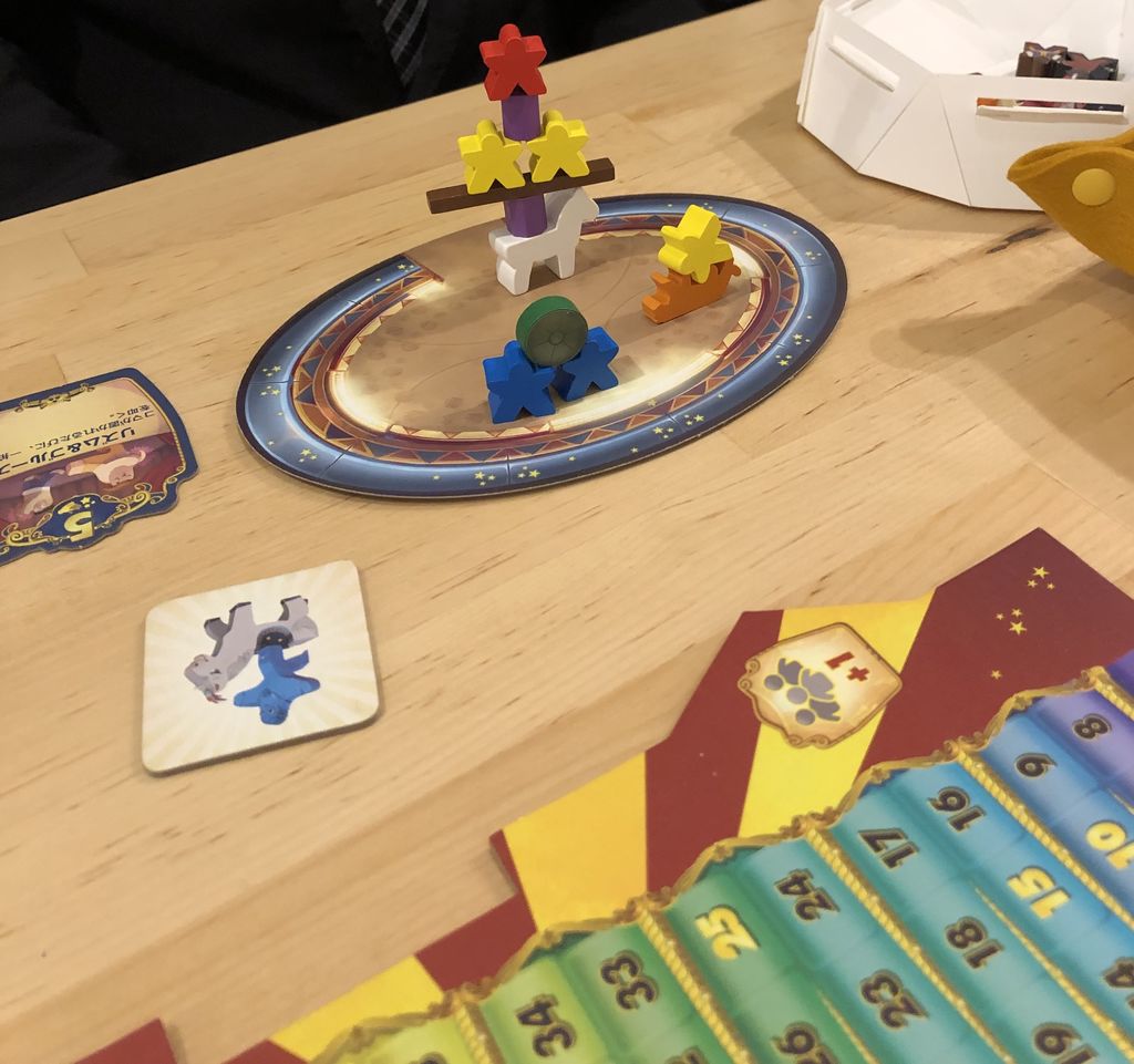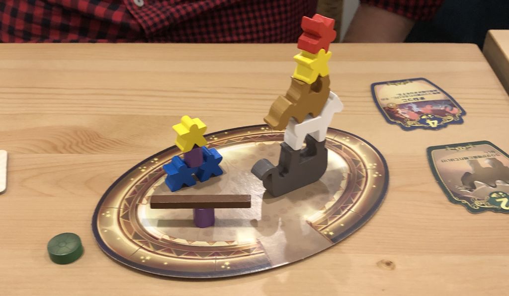 今回のプレイでは、3回目に加わったお題カードは、Aは「片目を手で覆いながら、もう片方の手だけで駒を積み上げる」で7点、Bは「駒を1つ積み上げる毎に、1拍手をする」で5点、Cは「動物駒を積み上げる際にその動物の鳴き真似をする」で4点、私は「積み上げているときにミープル駒を落とした際、「痛い、痛い、いたぁーい」と言う」で5点でした。