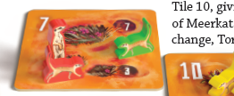 1. 砂漠タイル 3、4、5、6、7、8 では、タイル上にミーアキャットが最も多いプレイヤーが表示されている最高値を獲得し、ミーアキャットが2番目に多いプレイヤーが最低値を獲得します。砂漠のタイル 9、10、11、12 には、3つのスコアリングロケーションがあります。ミーアキャットの数が最も多いプレイヤーに最高値のポイントを、2番目に多くのミーアキャットを持つプレイヤーに中間値のポイントを、3番目に多くのミーアキャットを持つプレイヤーに最低値のポイントを授与します。