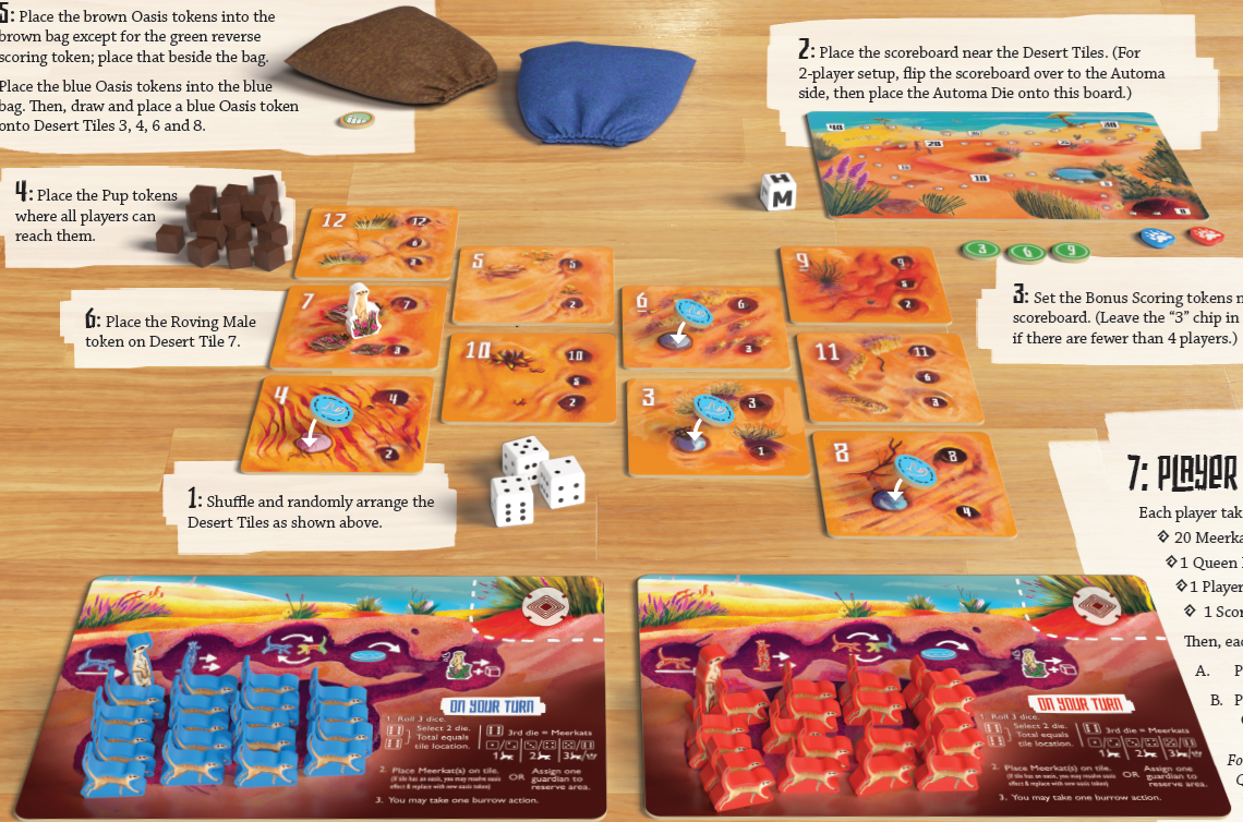 オートマ用に未使用のミーアキャット色を選択します。セットアップ中に、ダイス2つを振って足し合わせ、合計に一致する砂漠タイルにオートマの女王を置きます。オートマはプレイヤー順の最後になります。オートマのターンに、他の3つのダイスと一緒にオートマのダイスを振ります。