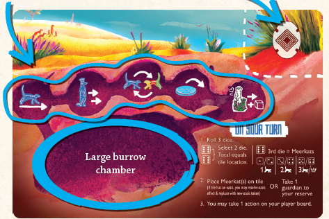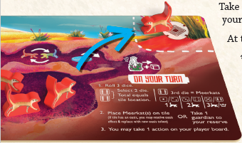 プレイヤーはターンの開始時にダイスを3つ振り、結果を改善するために1回振り直すオプションもあります(任意のダイスを振り直して、2回目に振った結果を使用できます)。次に、ダイスを使用してミーアキャットを砂漠のタイルに配置するか、リザーブにガーディアンを割り当てます。その後、巣穴アクションを1回行うことができます。