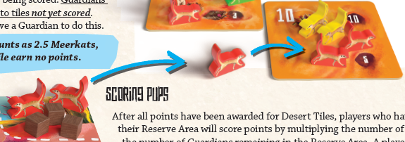 ・ガーディアンはスコアリング中に砂漠タイルに移動して、そこでマジョリティを変更することができます。スコアリング中に砂漠のタイルであなたが最高値を獲得した場合、あなたのガーディアン1匹を、まだスコアリングされていない隣接するタイルの場所に移動して、マジョリティを強化するか、引き分けにすることができます。