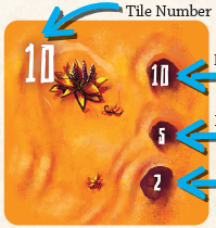 カラハリのすべての砂漠タイルには、最高値と最低値のゲーム終了時ポイントがあります。砂漠のタイル 9、10、11、12 には中間値もあります。タイル上のオアシストークンに別段の指示がない限り、タイル上にミーアキャットが最も多いプレイヤーが最高値のポイントを受け取ります。