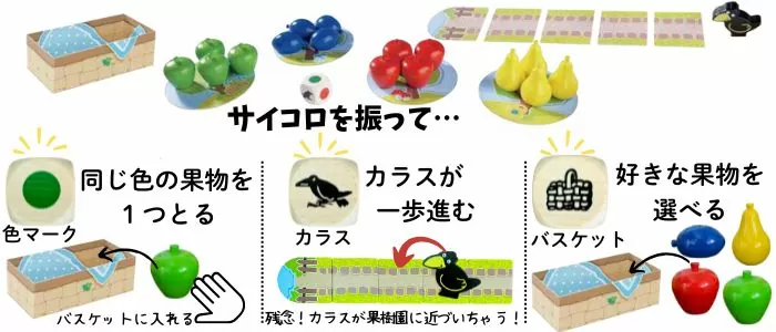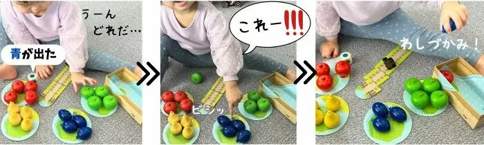 色が得意なのでサイコロと同じ色の果物をバスケットに入れることはできました!