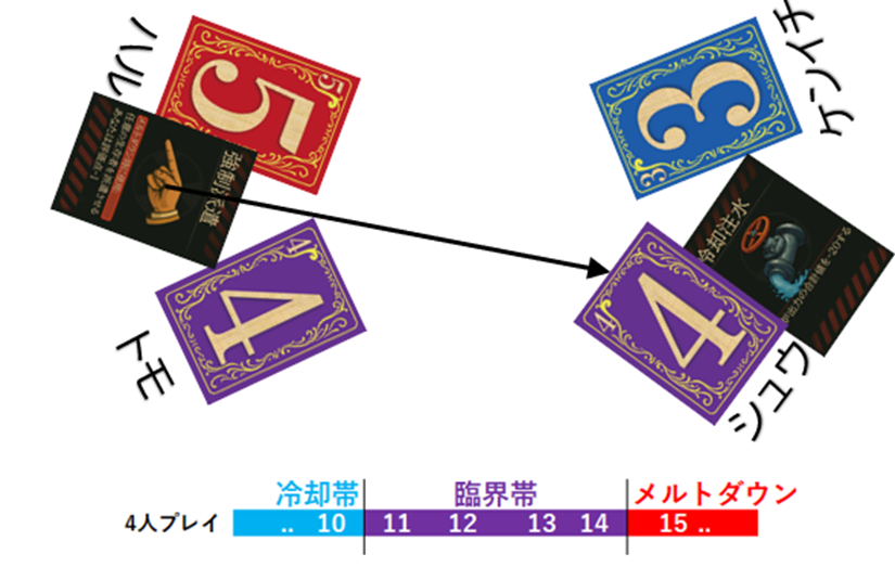 炉出力の合計値が-4なのでゾーン判定は冷却帯に変わり、最低値であるケンイチが手札を1枚捨てた