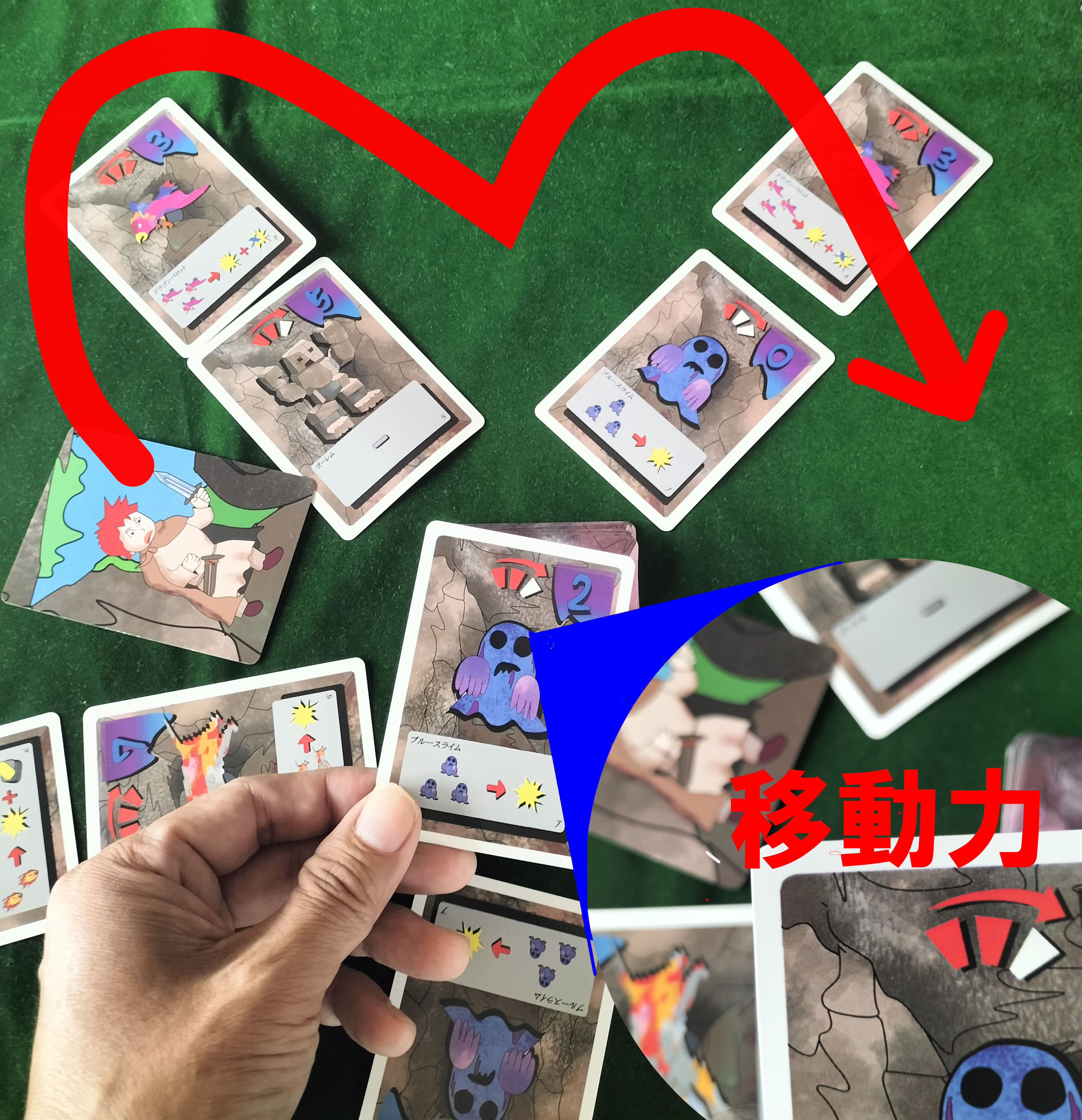 冒険者を移動させた後、冒険者と隣接する4枚のカードの中から1枚選び