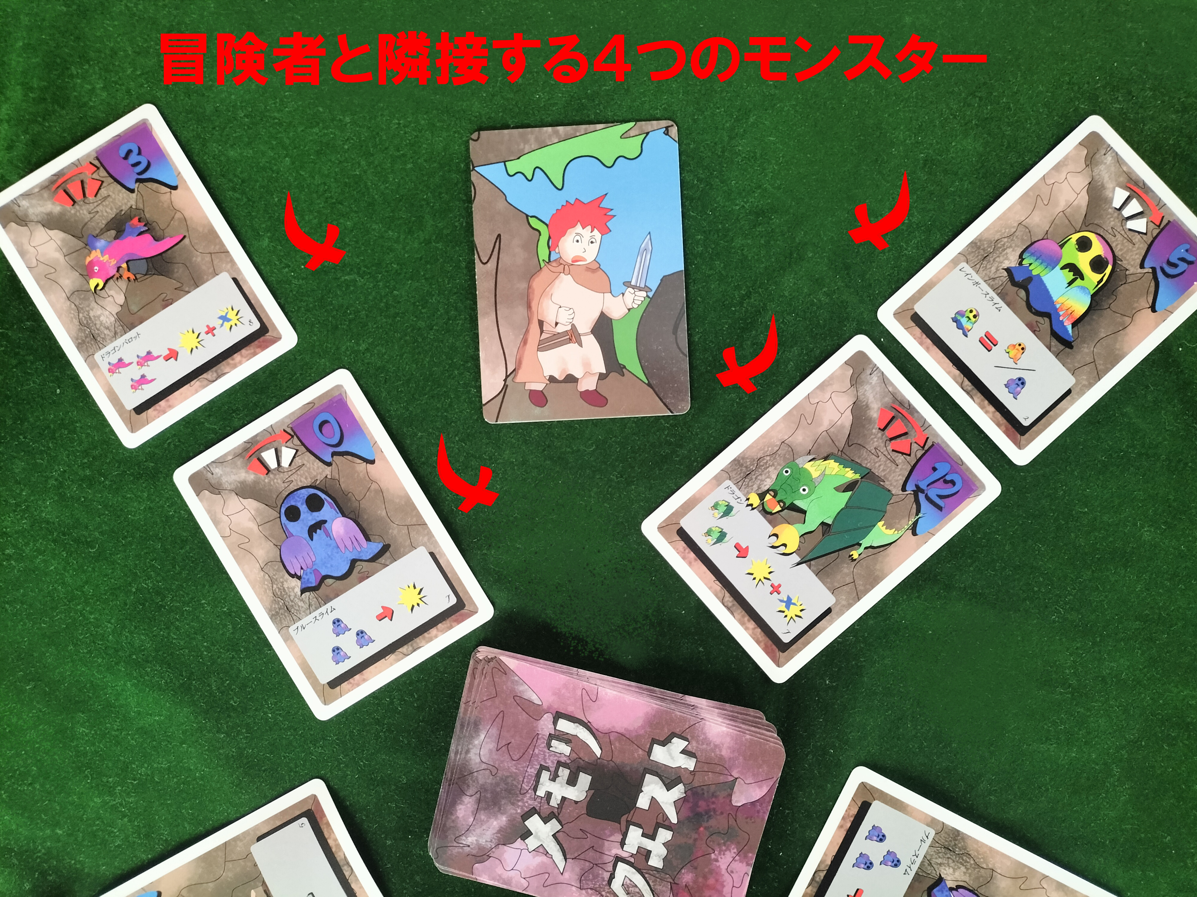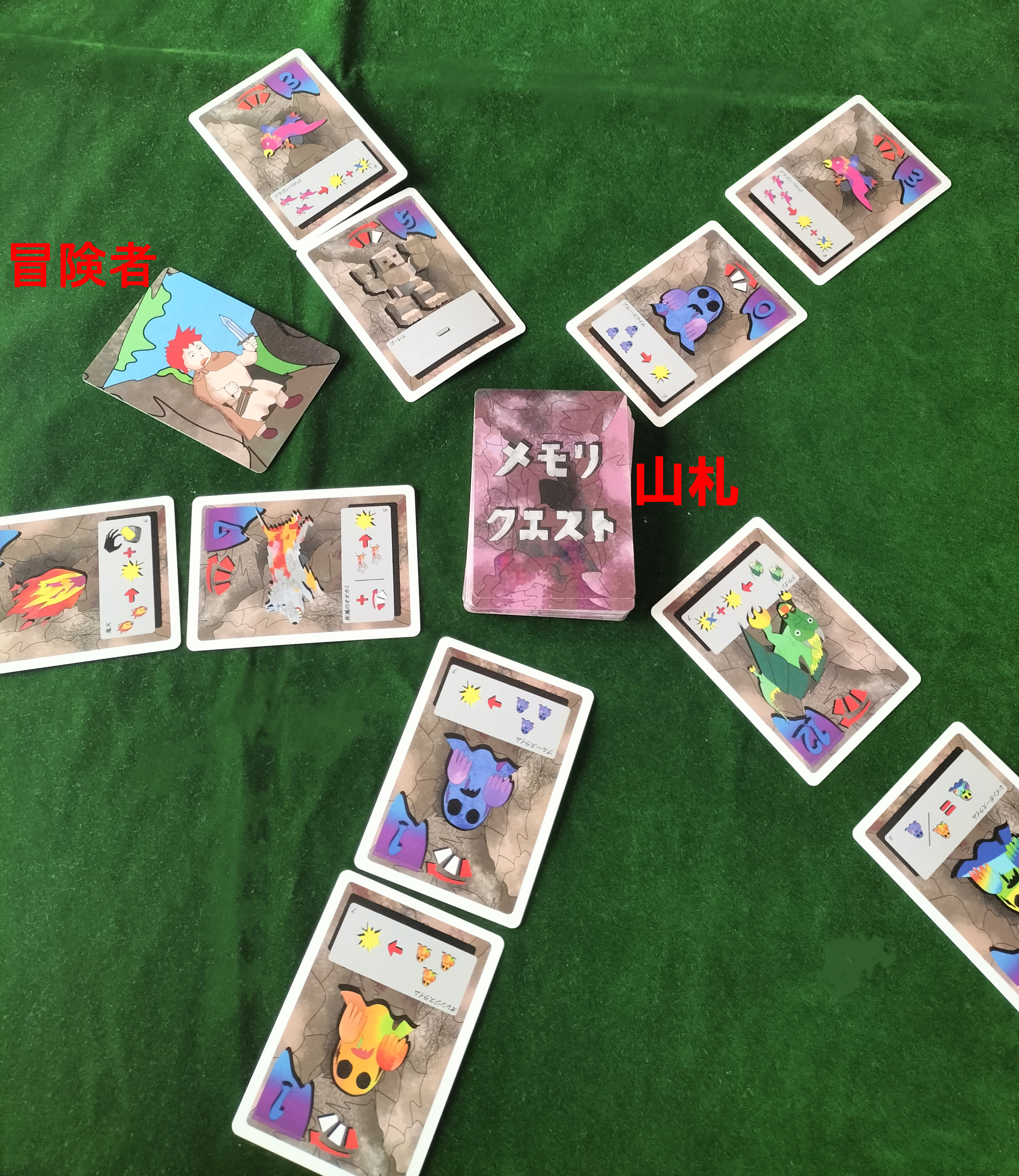 そして山札から放射状に10枚、2枚の5つの列にを作り冒険者をその間に適当におきます。