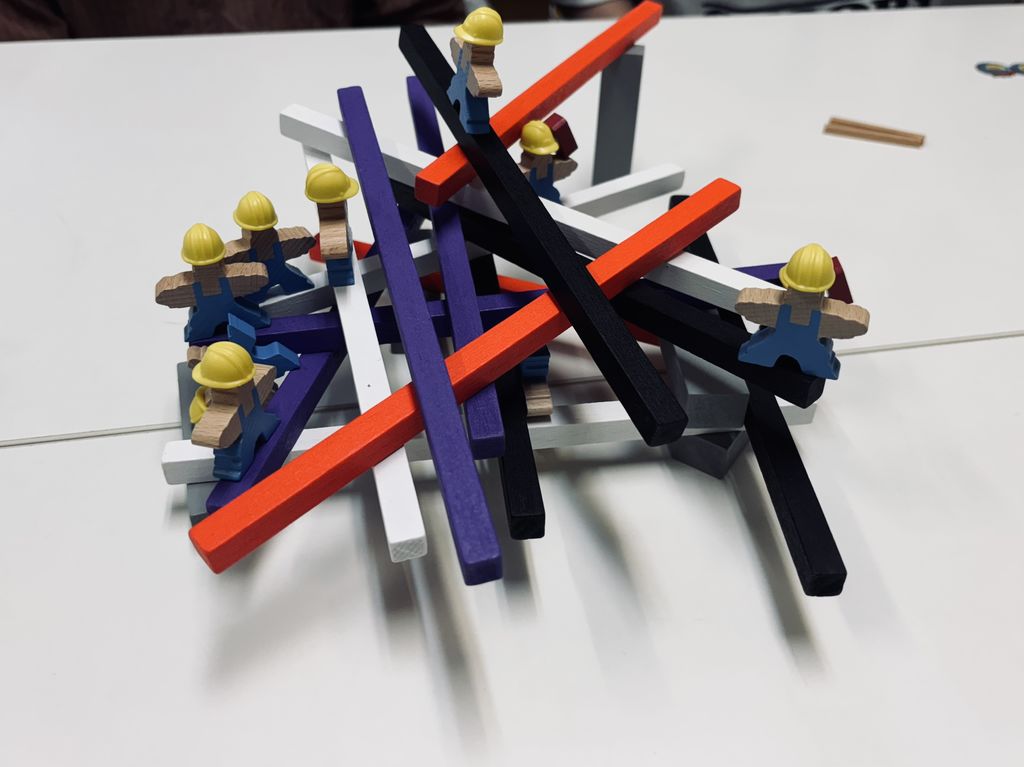 4色の鉄骨、人型の労働者コマ、灰色の土台、