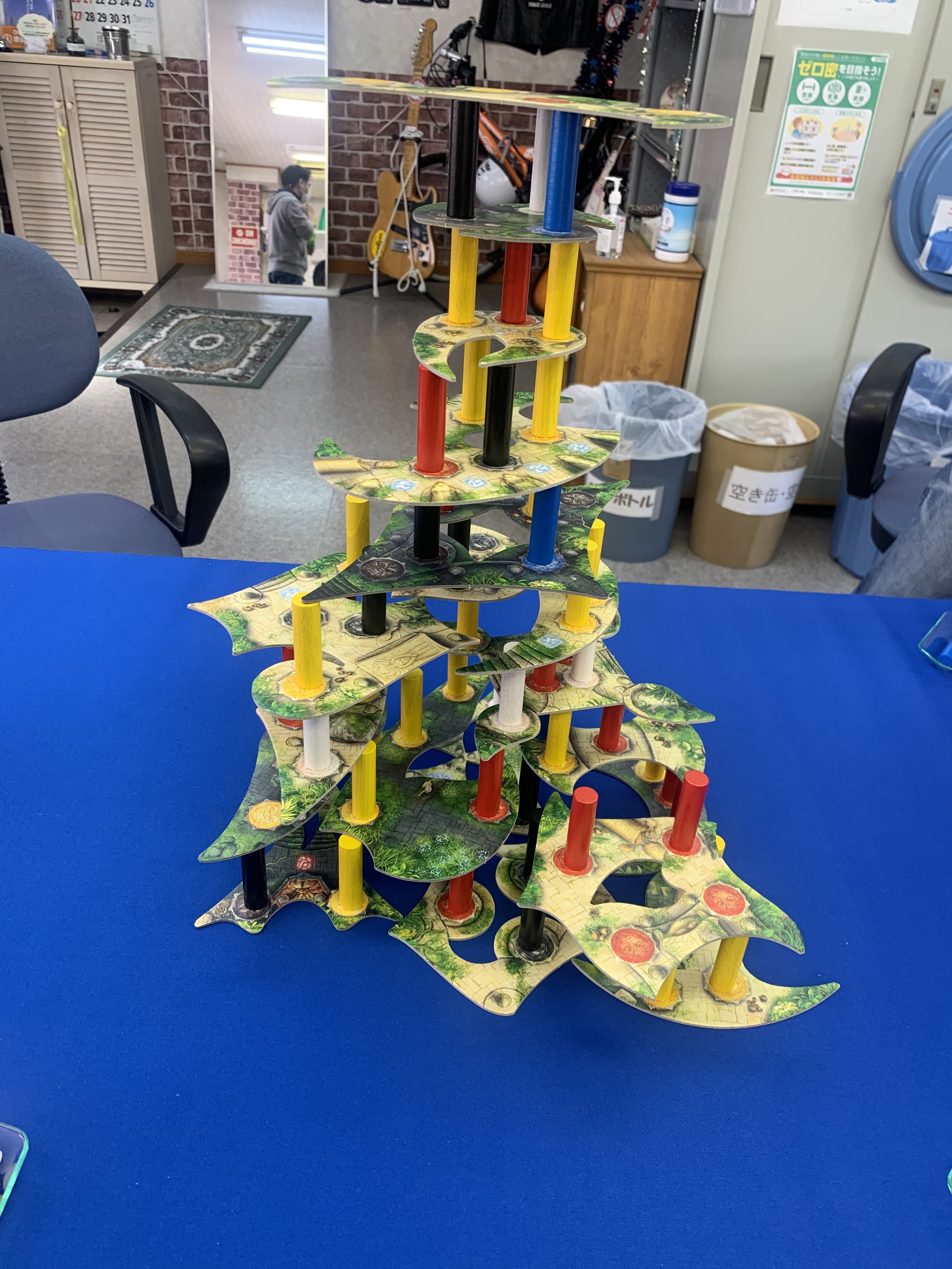 寺院を復元しようというテーマで、プレイヤーは限られた柱となる積み木を積み上げて目標の高さまで積み上げていきます。