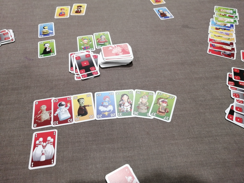 だいたいは1〜6からスタートになるかな。先行させ過ぎると一気に走られるから追いかけて数字を合わせてトップの数字カードを奪わないといけない感じになっているから、イライラしないでは難しいのでは?