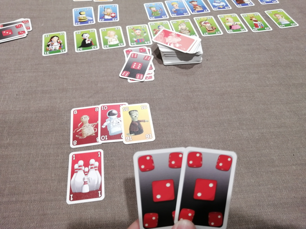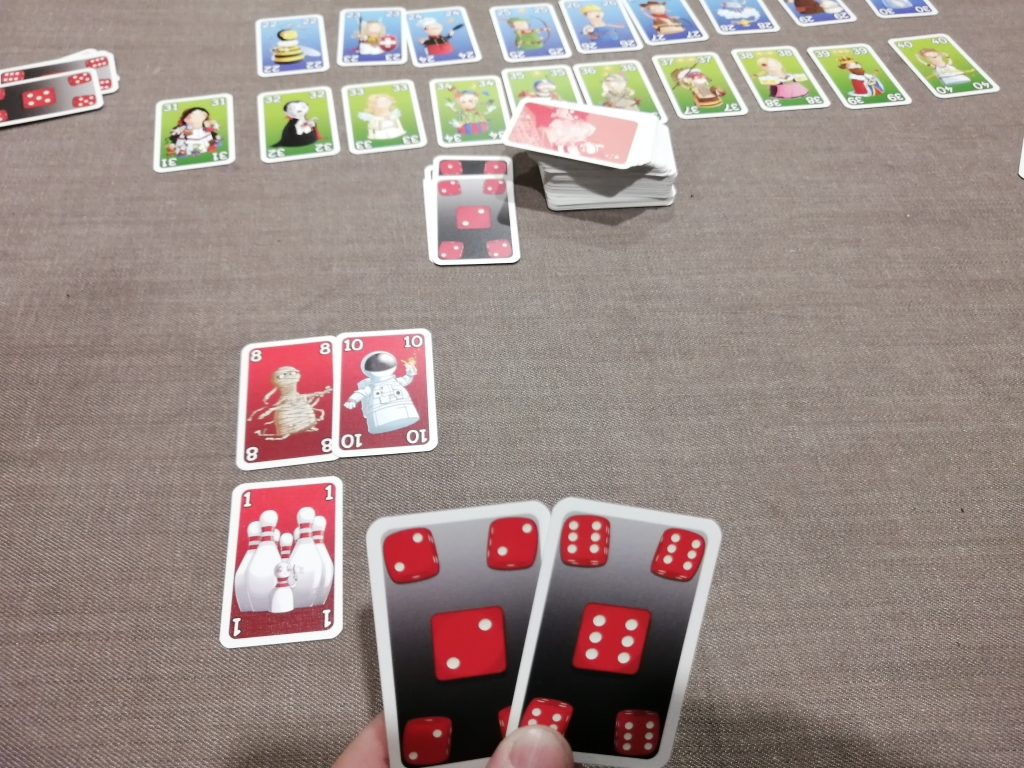 ダイスの出目が描かれたカードをプレイして、カードを獲得して自分の前に並べていき、すでに並べてあるカードに出目を足してカードを獲得して列を伸ばしていくか他プレイヤーからカードを奪うかします。