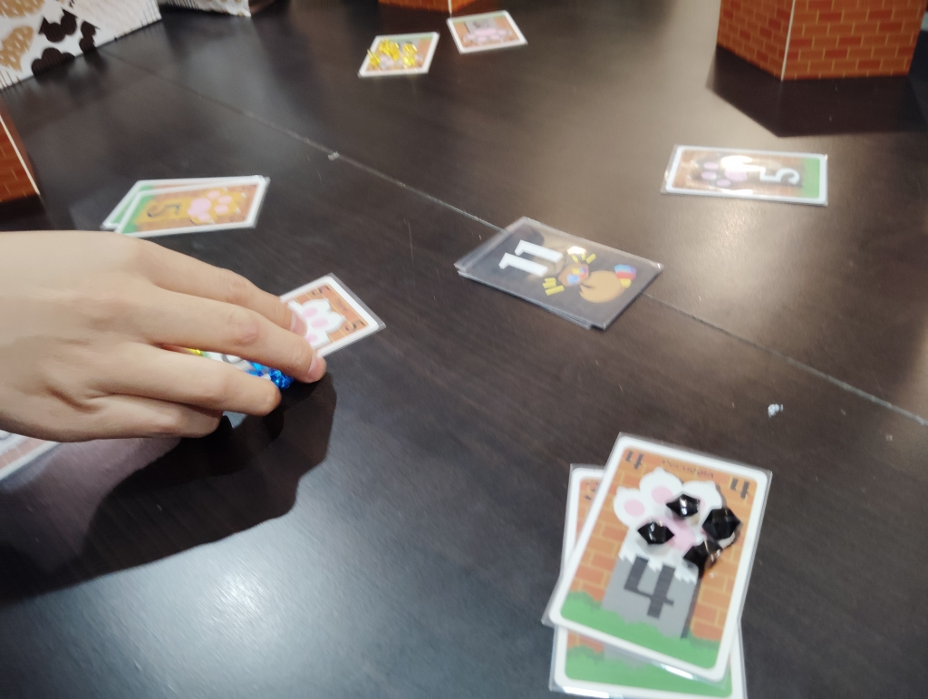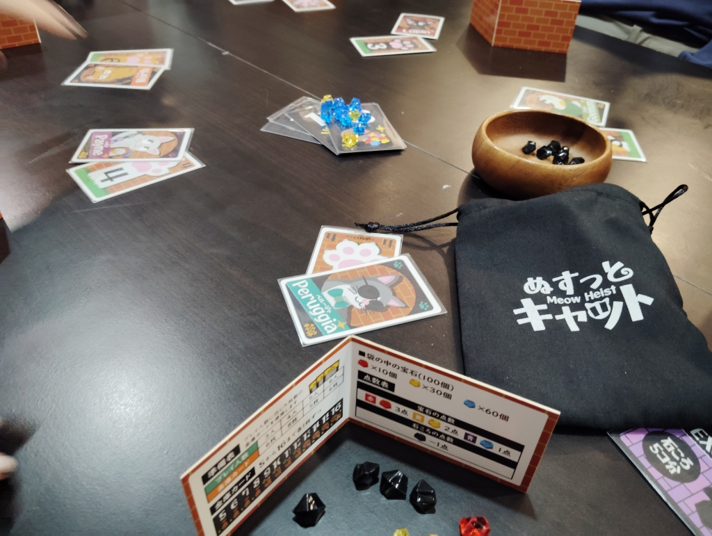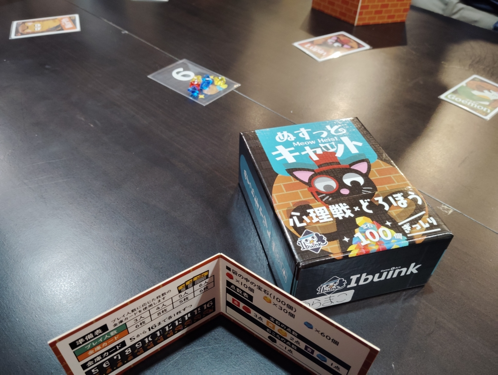 同時にカードを伏せて順番に公開していき、表にした際には『ニャー🐱』って数字と同じだけの宝石を金庫から取ります。数字が被ったら先に同じ数字を出したプレイヤーを『ガオ~』って襲って、宝石を持っているなら奪います。