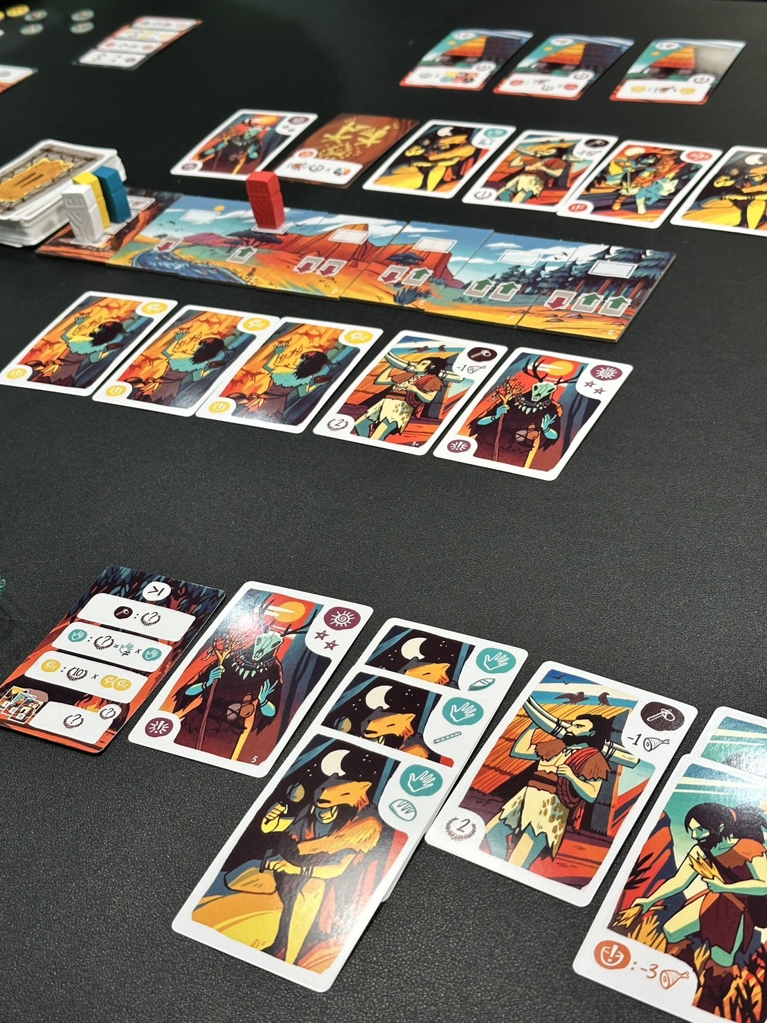 上段から1枚、下段から2枚などのマスを選択していくだけですが、あらかじめ見えているイベントがあると、「アイツはあれを取るから下段はもう残らないな」とか、「今は早く帰らないと食料が足りない」など、他プレイヤーの盤面を意識することが意外と多いです。