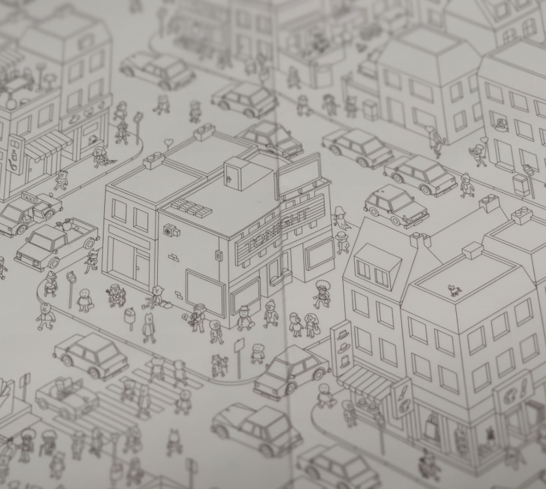 ゲームボードを広げた瞬間、目の前に現れるのは、白黒ながらも生き生きと描かれた街「クライムシティ」。