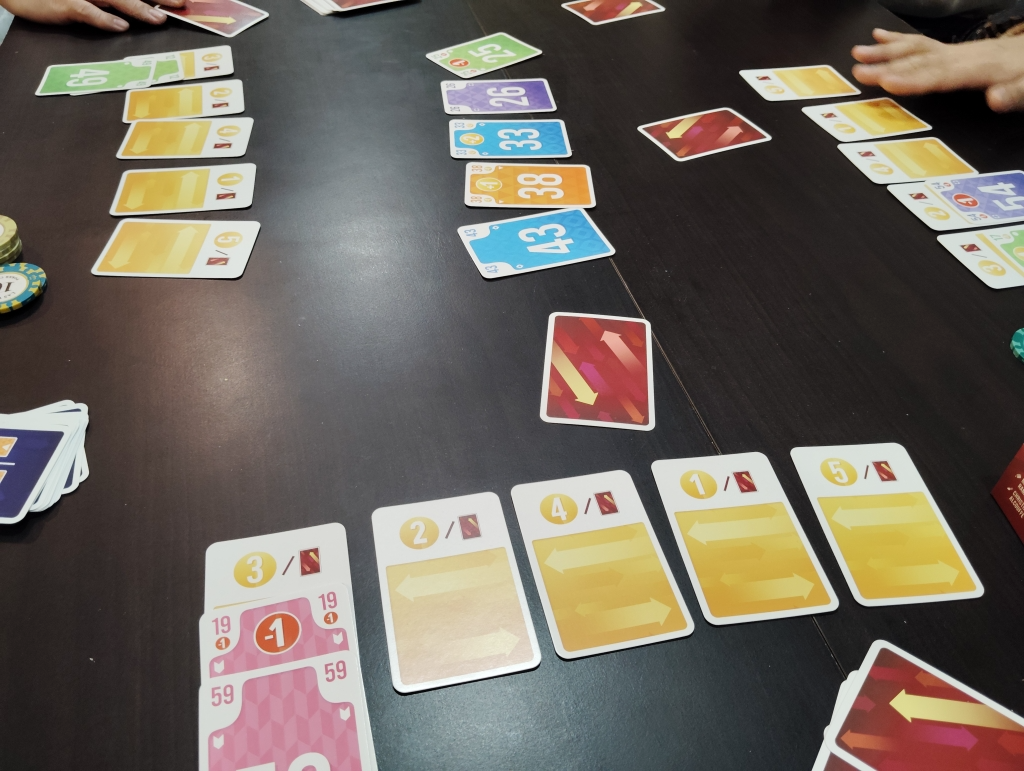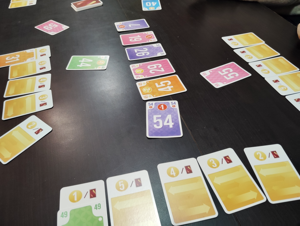 獲得したカードは、1色目は左端に配置して2色目は2番目に配置していくことになり、配置した場所により1枚◯点のカードになるので、得点が高い位置に配置できた色のカードはたくさん集めたいです。