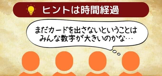 他のプレイヤーがカードを出す様子がないと、「他の人たちは数字が大きいのかな…じゃあ自分が一番小さいかも!」というように予想してカードを出していきます。