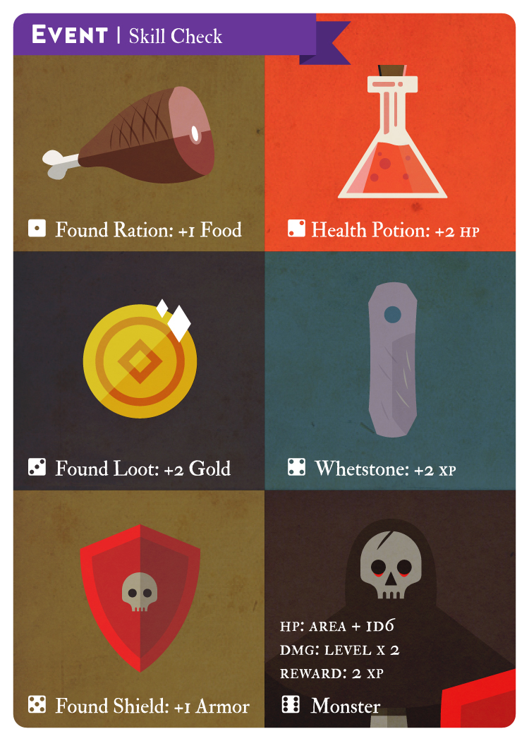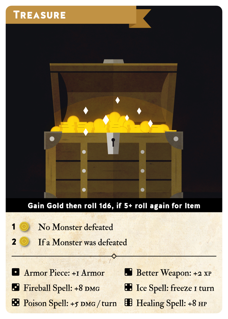 あなたがすでに現在のエリアですでにモンスターを倒している場合、あなたは金貨(Gold pieces)を2枚を得ます。そうでなければ1枚のみです。キャラクターカードのGoldトークンを移動させてください。その後ダイスを一つ振り、結果が5以上だった場合、特別なアイテムを発見します。再びダイスを振り、どのアイテムを発見したかを決定してください。見つけたアイテムに従って、キャラクターカードを更新してください。