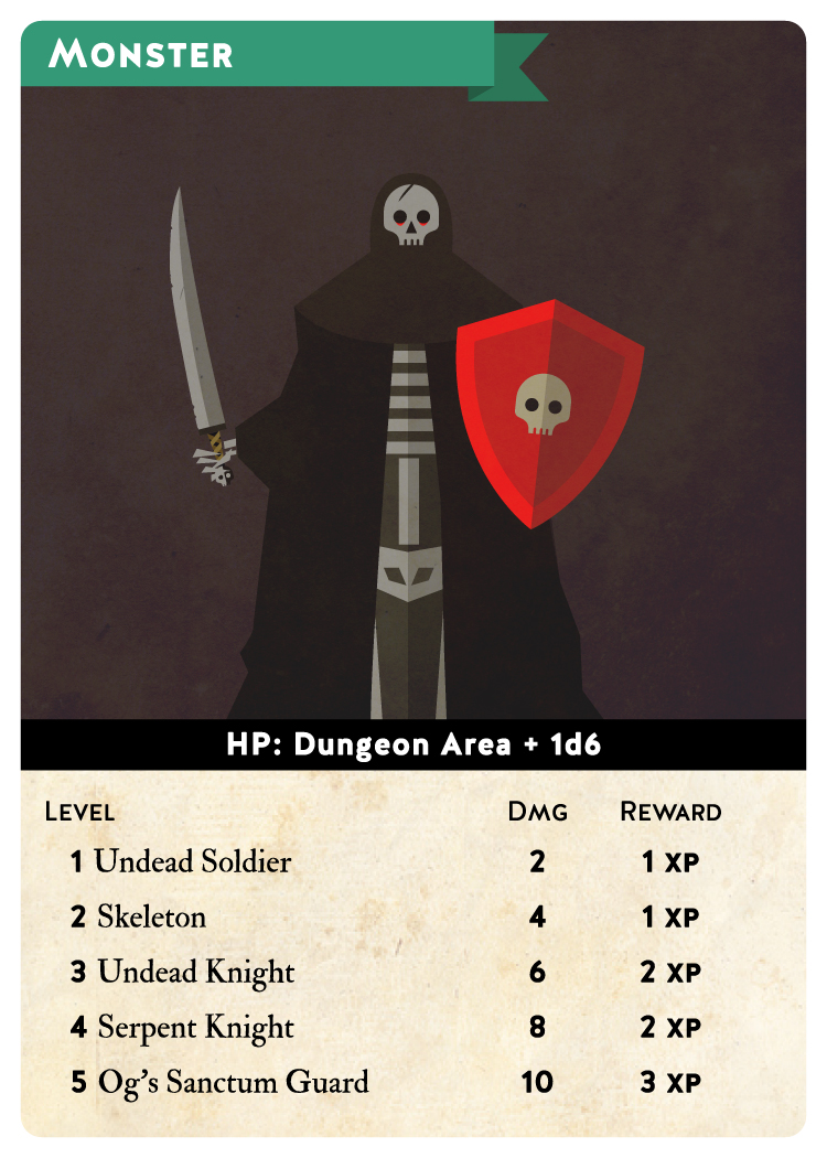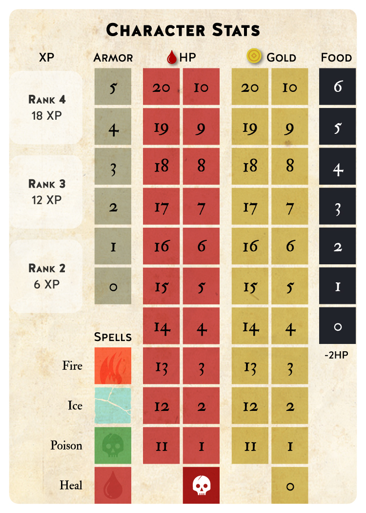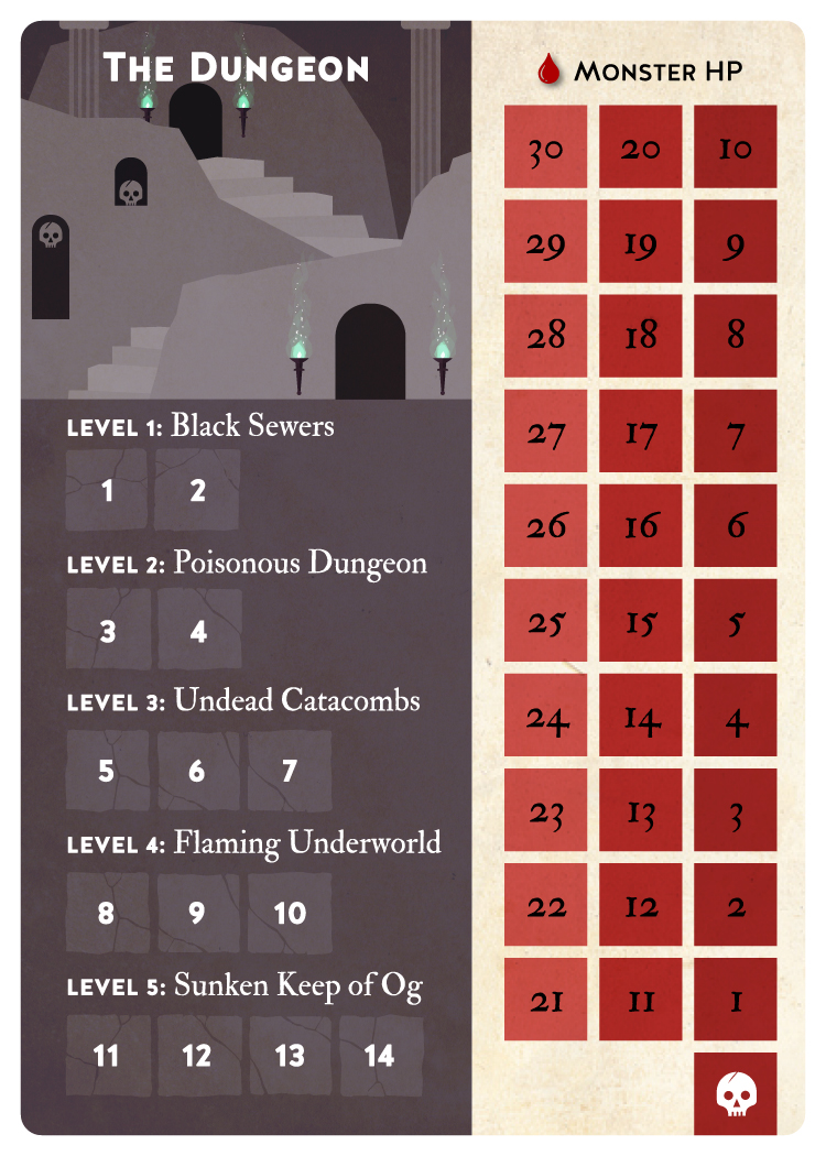 Armor HP Gold Food Casual 1 5 5 6 Normal 0 5 3 6 Hard 0 4 2 3 Impossible 0 3 1 3 - ダンジョンカードを表向きに、キャラクターステータスカードの隣に配置します。トークンをダンジョンの最初のエリアに置きます。このトークンはあなたの冒険者を表します。ダンジョンカードのモンスターHP欄のわきにトークンを配置します。モンスターと遭遇した際にモンスターのHPを管理する時に使用します。