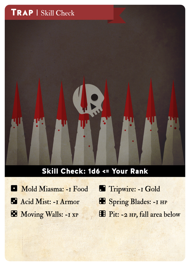 Mini Rogueにおける遭遇の中には、解決にスキル判定(Skill Check)が必要なものがあります。スキル判定を行うには、ダイスを1つ振り、キャラクターのランクと比べます。ランク以下であれば成功となり、トラップを無視して、降りかかるはずだった結果を無効にできます。ゲームを新しく始めるたびにランクは1から始まることに気を付けてください。