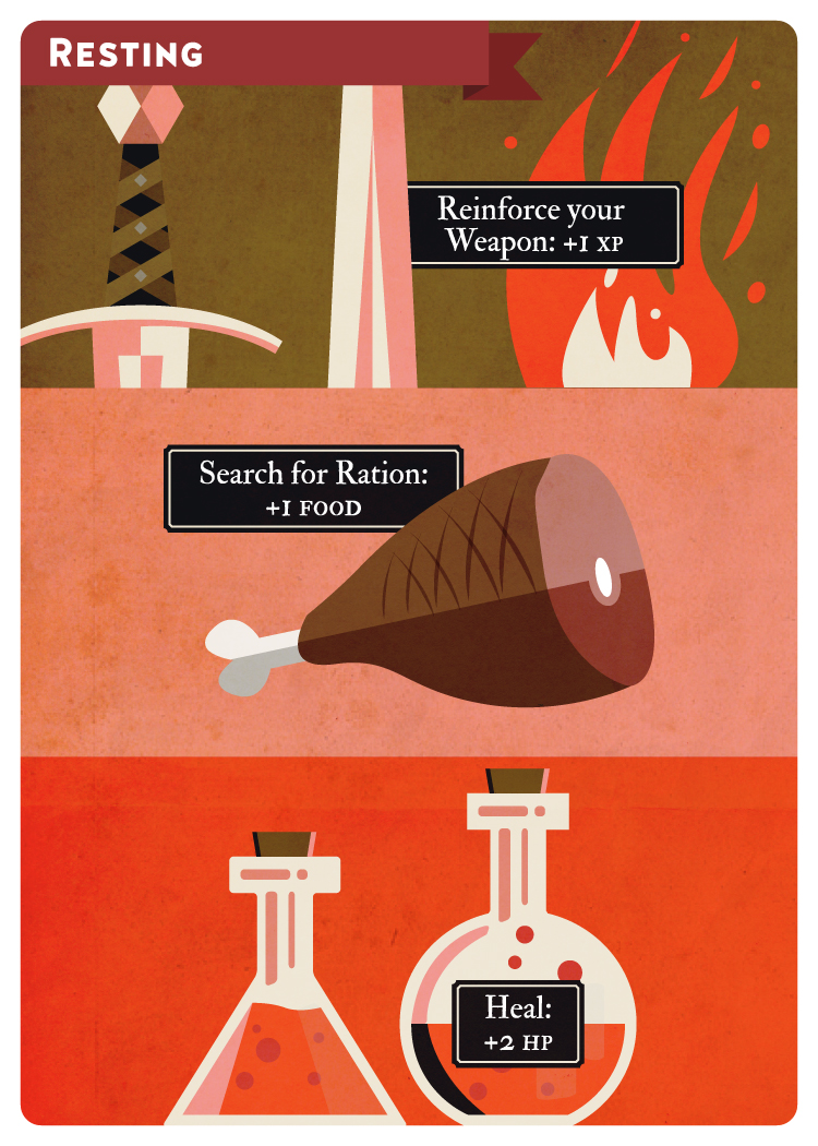 - 列の最後のカードが解決されたら、食料(Food Ration)を1消費します(「キャラクターステータス」参照)。キャラクターシートのFood欄のトークンを移動させてください。もし探索フェイズ開始時にFoodの残りがない場合は、ただちに冒険者のHPを2減少させます。