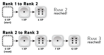 例)Oscarはランク2で、5XPを所有している。彼はXP記録欄の最初のスロットにダイスを置いている。Oscarはモンスターを倒し2XPを獲得した。彼の経験値は計7XPとなった。彼はXP記録欄のダイスの面をいったん6にし、それからランク3のスロットに1の面を上にして配置し直した。