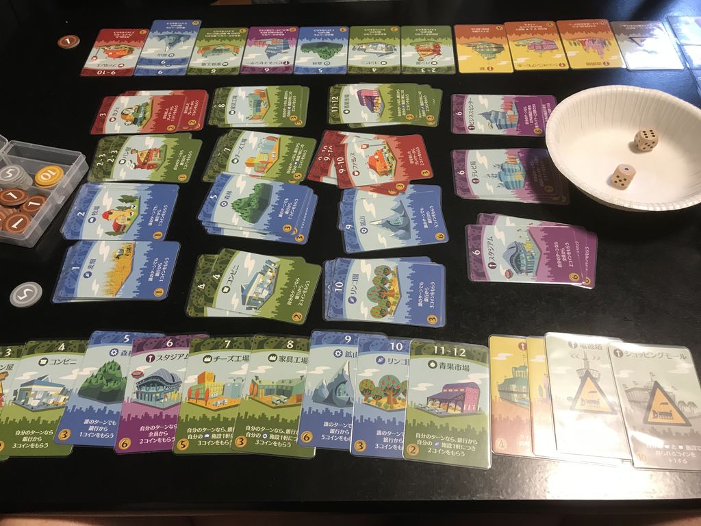 しかし、今回はホント出目が偏った!1/6の7が出ずに「9」が連発。チーズ工場を無視して、鉱山2棟とファミレス1軒を建てた娘が「9」が出る度12金ゲットで最速ランドマーク4棟。