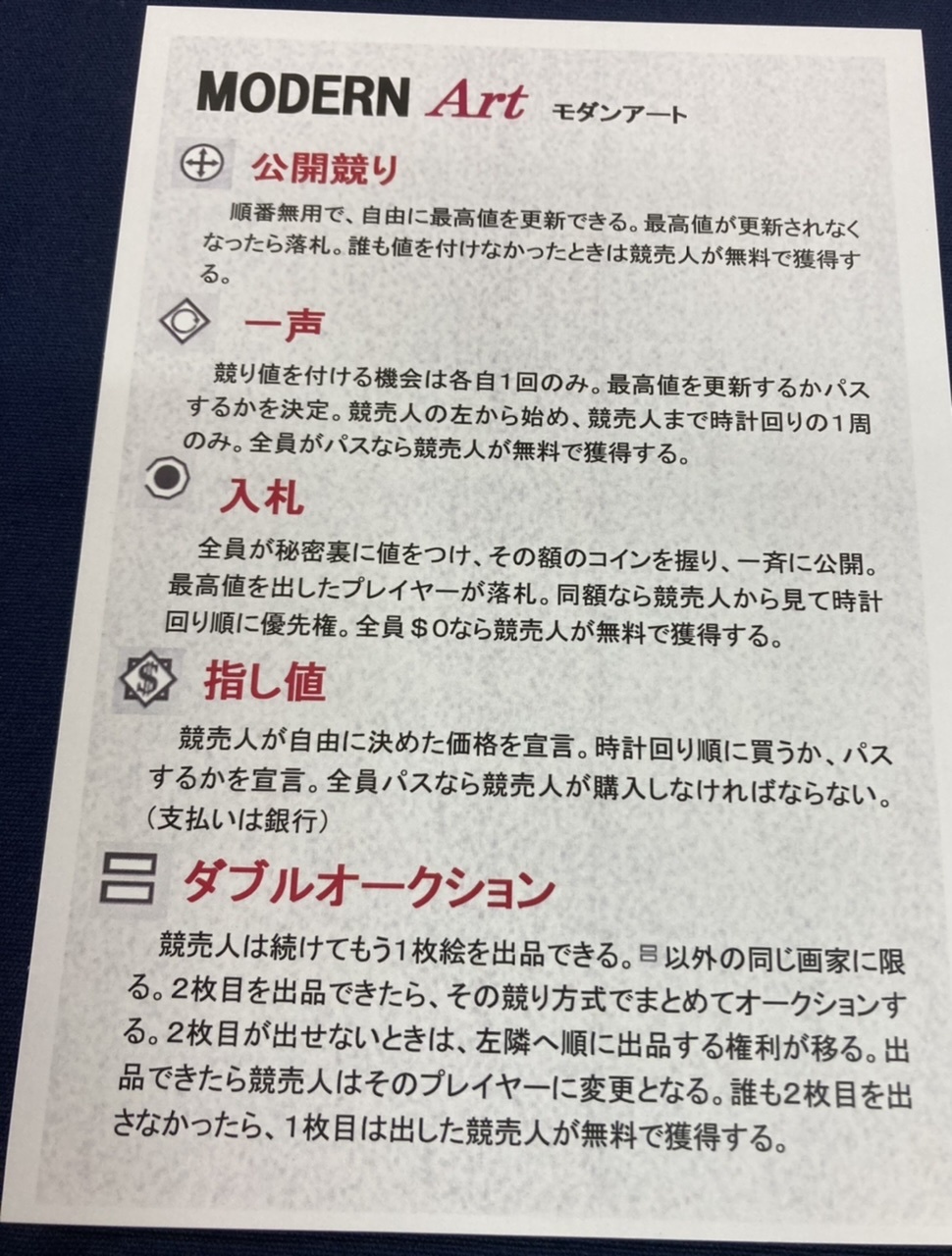 何せ絵画ごとに指定されている競り方法が異なるため、全員が自由に値を付けるもの、各自1回だけしか宣言できないものなど、その時に応じて値段の戦略が変わるのです。
