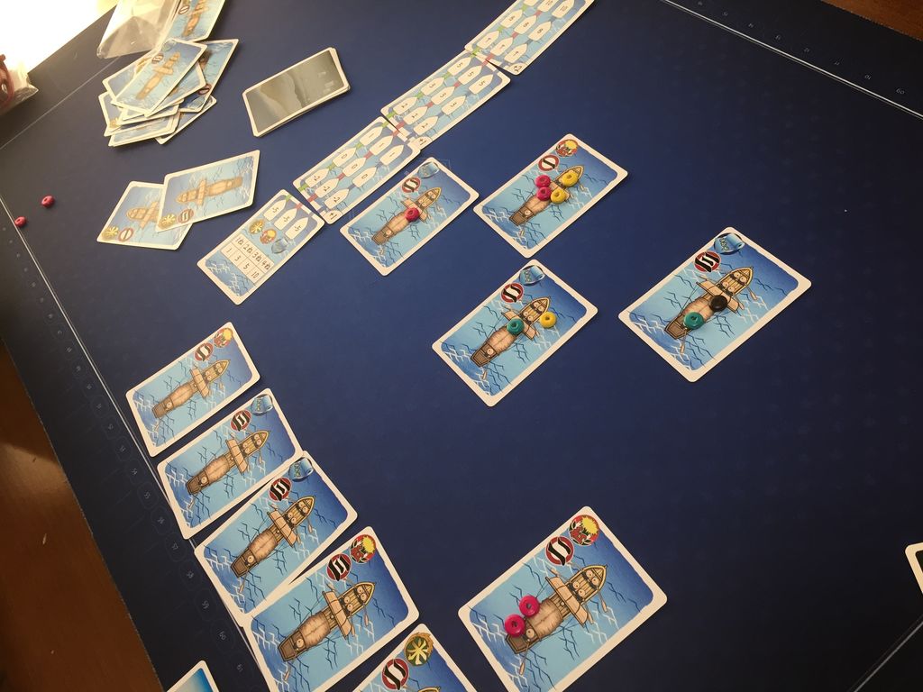 一番下の列にカードを船として並べて、ラウンドカードと次のラウンドカードを1枚ずつ準備します(写真だと左上)