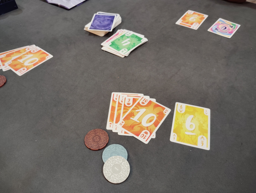 裏返していたカードをすべて公開したプレイヤーが現れたらラウンド終了でカードの数字がそのまま失点になりますが、同じ色のカードは重ねることができ、数字が違う場合には大きい数字だけが失点になります。