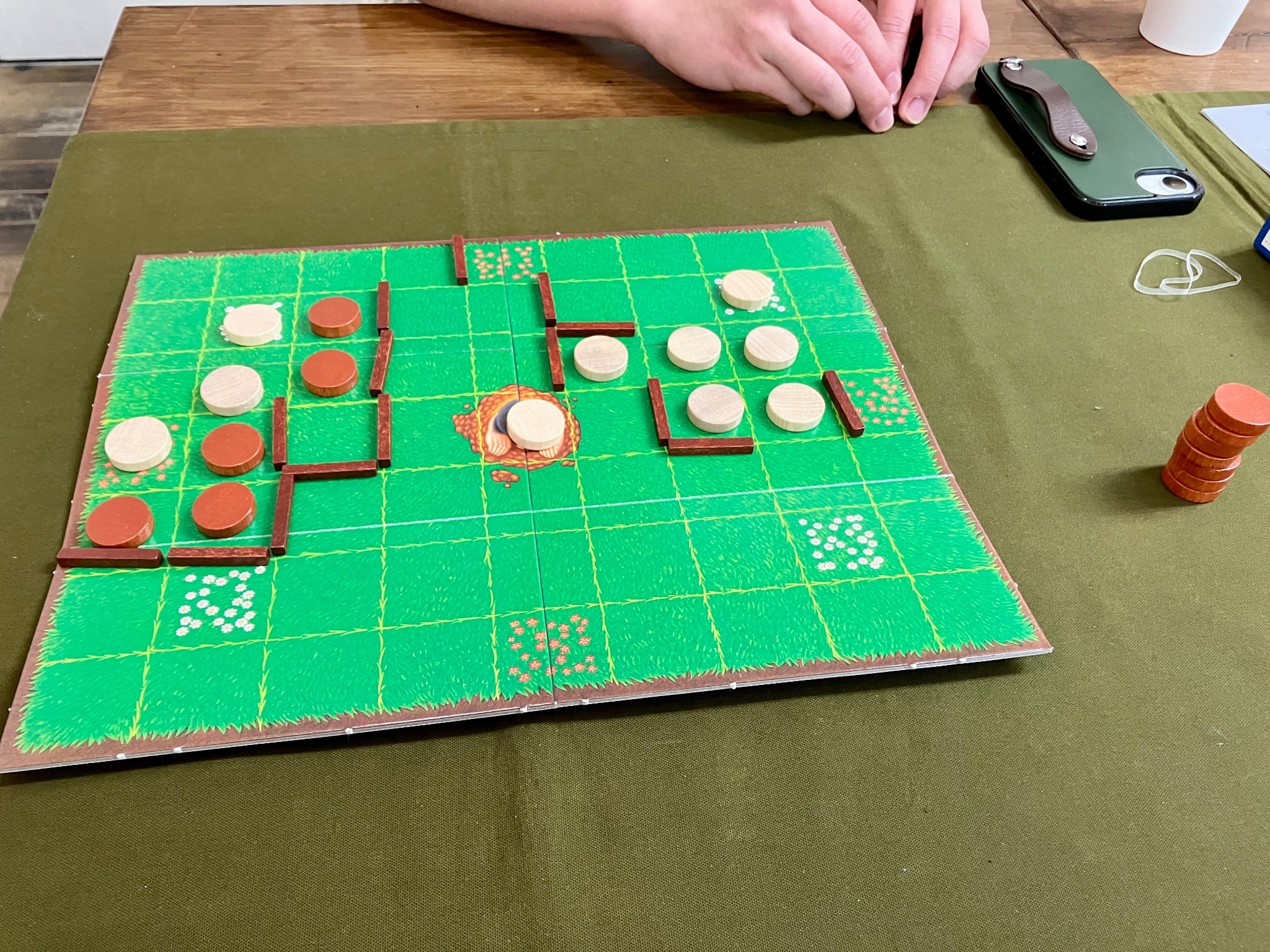 モグラと庭師の戦い。モグラは11歩目から出る赤土と花畑が得点で、庭師は柵を置いて邪魔をする。役割を入れ替えて2戦行う。モグラは抜け道が多いので逃げられてしまうが、策を講じて捕まえられると大きな達成感がある。古き良きクニツィア作。