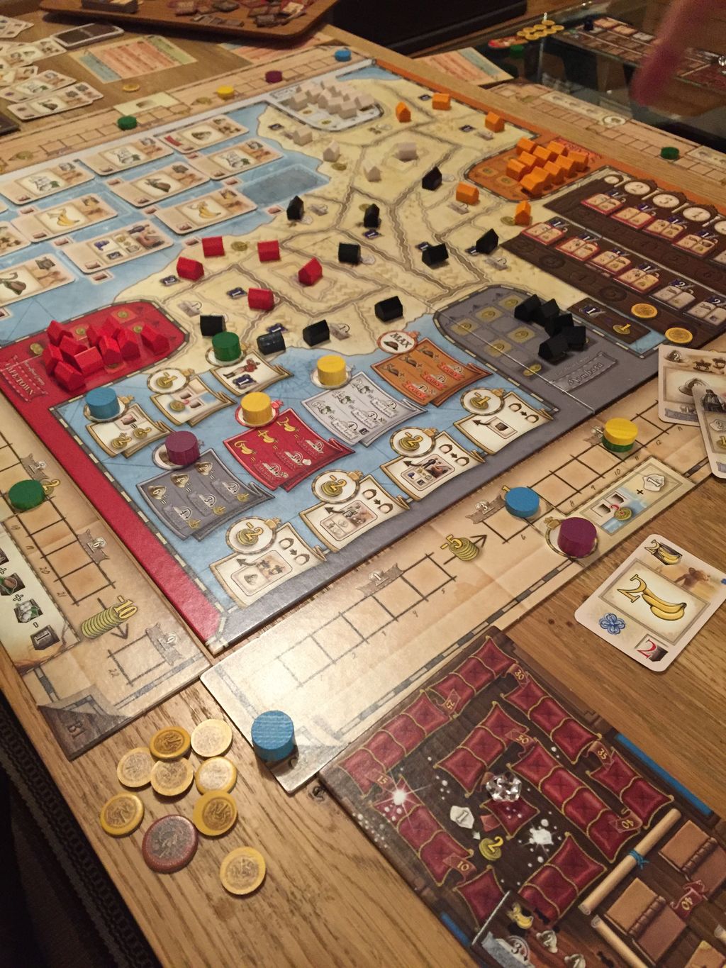 モンバサは自分1人しかいない上に、カイロとモンバサの間の境界線一本のエリアを取られてしまっており、その後のカイロの侵食に備えて5つ目の拠点を作っておきたかったのと、マップ中央の1金, 1帳簿, 1ダイヤスペースを押さえることでダイヤ商人で3つ進めるようにできたため。