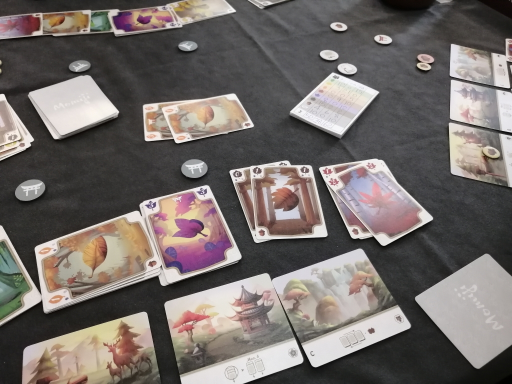 目的としては、1番紅葉を楽しんだと分かるように自分の前に0→3と昇順になるように各色カードを重ねていく(同数字か1つ上なら重ねられる)。