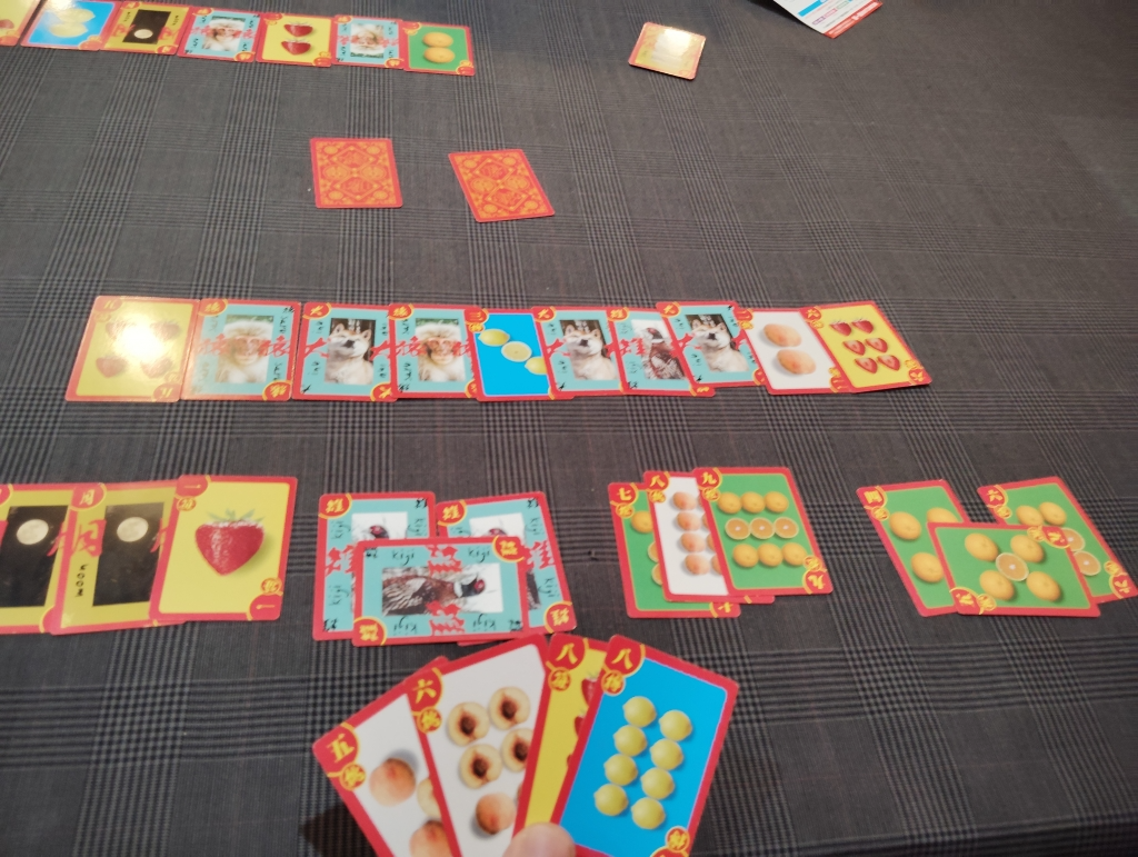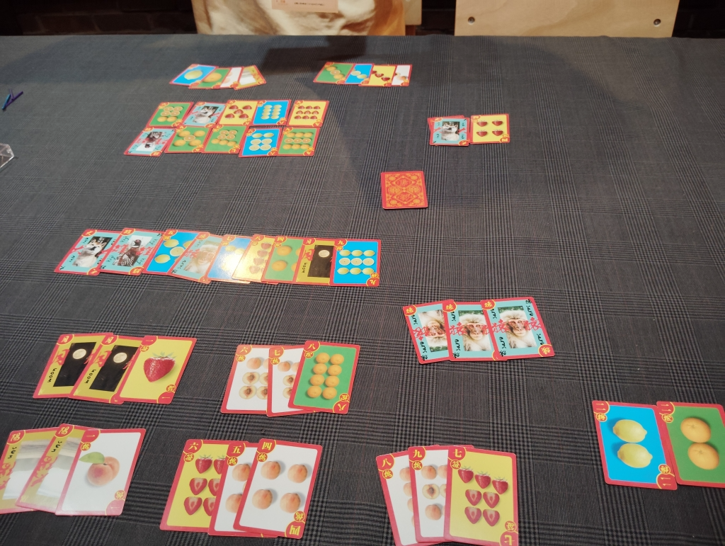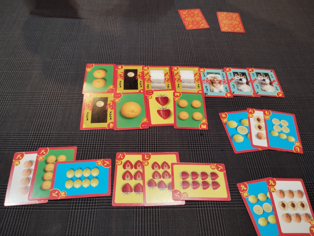 ルールは麻雀ベースですが、1〜9はフルーツスートで4種類あり内1種類はオールマイティー(桃)です。